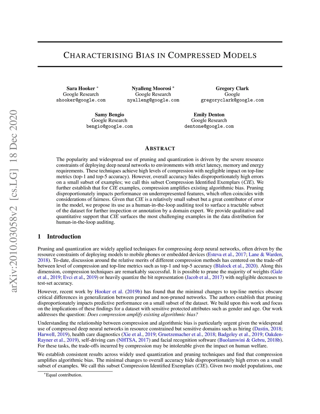 The popularity and widespread use of pruning and quantization is driven by the severe resource constraints of deploying deep neural networks to environments with strict latency, memory and energy requirements. These techniques achieve high levels of compression with negligible impact on top-line metrics (top-1 and top-5 accuracy). However, overall accuracy hides disproportionately high errors on a small subset of examples; we call this subset Compression Identified Exemplars (CIE). We further establish that for CIE examples, compression amplifies existing algorithmic bias. Pruning disproportionately impacts performance on underrepresented features, which often coincides with considerations of fairness. Given that CIE is a relatively small subset but a great contributor of error in the model, we propose its use as a human-in-the-loop auditing tool to surface a tractable subset of the dataset for further inspection or annotation by a domain expert. We provide qualitative and quantitative support that CIE surfaces the most challenging examples in the data distribution for human-in-the-loop auditing.