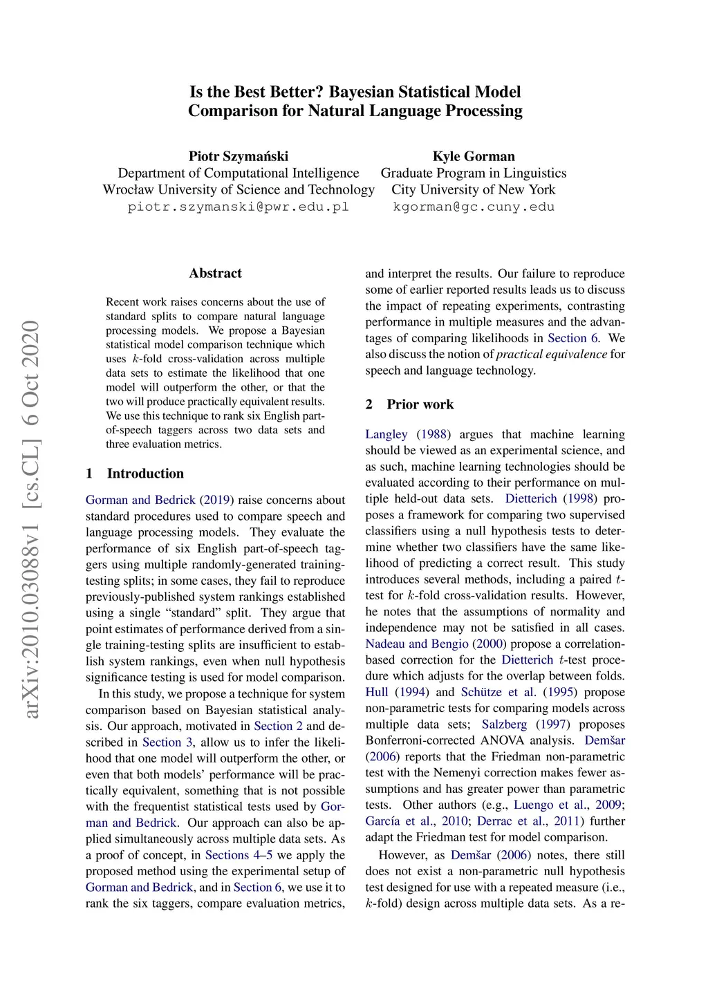Recent work raises concerns about the use of standard splits to compare natural language processing models. We propose a Bayesian statistical model comparison technique which uses k-fold cross-validation across multiple data sets to estimate the likelihood that one model will outperform the other, or that the two will produce practically equivalent results. We use this technique to rank six English part-of-speech taggers across two data sets and three evaluation metrics.