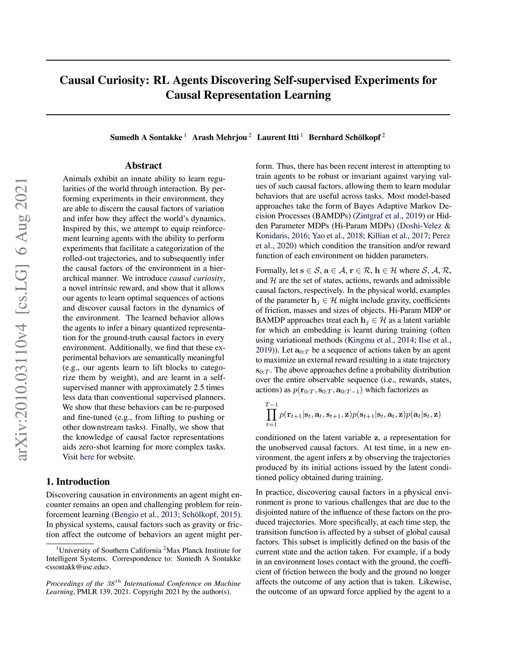 Animals exhibit an innate ability to learn regularities of the world through interaction. By performing experiments in their environment, they are able to discern the causal factors of variation and infer how they affect the world's dynamics. Inspired by this, we attempt to equip reinforcement learning agents with the ability to perform experiments that facilitate a categorization of the rolled-out trajectories, and to subsequently infer the causal factors of the environment in a hierarchical manner. We introduce {\em causal curiosity}, a novel intrinsic reward, and show that it allows our agents to learn optimal sequences of actions and discover causal factors in the dynamics of the environment. The learned behavior allows the agents to infer a binary quantized representation for the ground-truth causal factors in every environment. Additionally, we find that these experimental behaviors are semantically meaningful (e.g., our agents learn to lift blocks to categorize them by weight), and are learnt in a self-supervised manner with approximately 2.5 times less data than conventional supervised planners. We show that these behaviors can be re-purposed and fine-tuned (e.g., from lifting to pushing or other downstream tasks). Finally, we show that the knowledge of causal factor representations aids zero-shot learning for more complex tasks. Visit https://sites.google.com/usc.edu/causal-curiosity/home for website.
