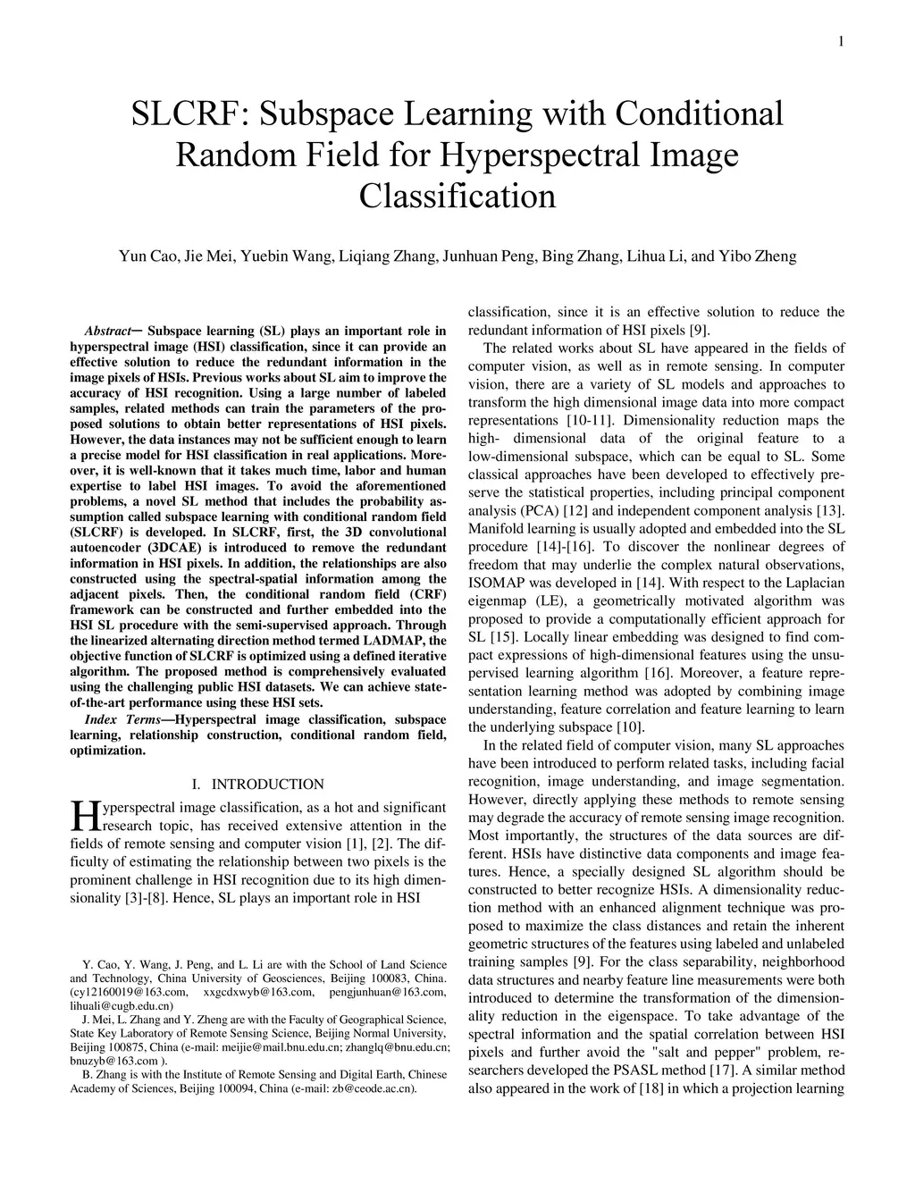 SLCRF: Subspace Learning with Conditional Random Field for Hyperspectral