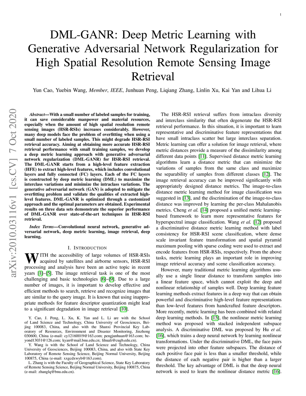 With a small number of labeled samples for training, it can save considerable manpower and material resources, especially when the amount of high spatial resolution remote sensing images (HSR-RSIs) increases considerably. However, many deep models face the problem of overfitting when using a small number of labeled samples. This might degrade HSRRSI retrieval accuracy. Aiming at obtaining more accurate HSR-RSI retrieval performance with small training samples, we develop a deep metric learning approach with generative adversarial network regularization (DML-GANR) for HSR-RSI retrieval. The DML-GANR starts from a high-level feature extraction (HFE) to extract high-level features, which includes convolutional layers and fully connected (FC) layers. Each of the FC layers is constructed by deep metric learning (DML) to maximize the interclass variations and minimize the intraclass variations. The generative adversarial network (GAN) is adopted to mitigate the overfitting problem and validate the qualities of extracted high-level features. DML-GANR is optimized through a customized approach, and the optimal parameters are obtained. The experimental results on the three data sets demonstrate the superior performance of DML-GANR over state-of-the-art techniques in HSR-RSI retrieval.