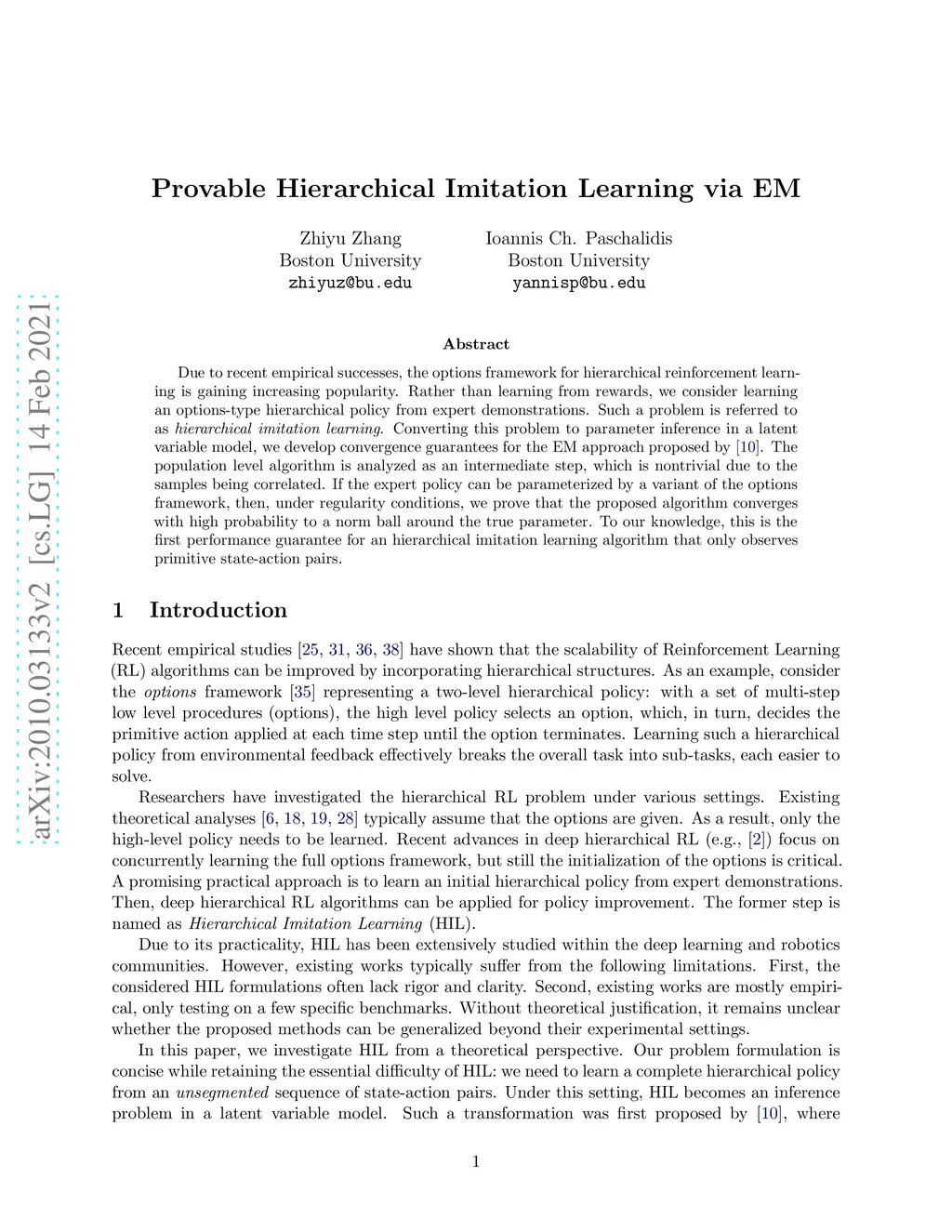 Due to recent empirical successes, the options framework for hierarchical reinforcement learning is gaining increasing popularity. Rather than learning from rewards which suffers from the curse of dimensionality, we consider learning an options-type hierarchical policy from expert demonstrations. Such a problem is referred to as hierarchical imitation learning. Converting this problem to parameter inference in a latent variable model, we theoretically characterize the EM approach proposed by Daniel et al. (2016). The population level algorithm is analyzed as an intermediate step, which is nontrivial due to the samples being correlated. If the expert policy can be parameterized by a variant of the options framework, then under regularity conditions, we prove that the proposed algorithm converges with high probability to a norm ball around the true parameter. To our knowledge, this is the first performance guarantee for an hierarchical imitation learning algorithm that only observes primitive state-action pairs.