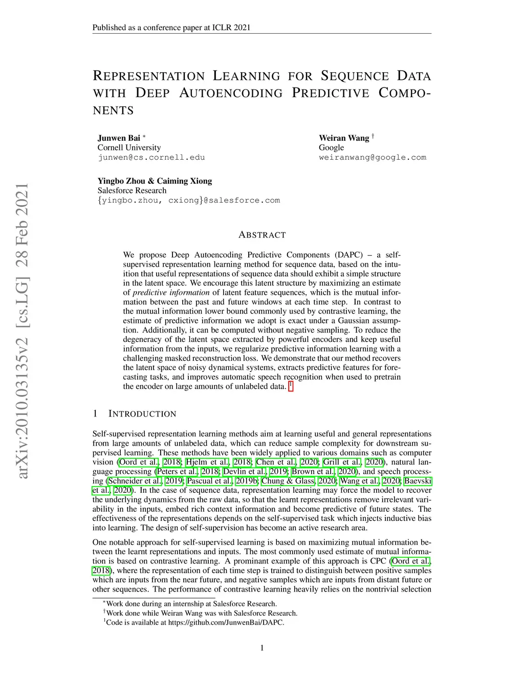 We propose Deep Autoencoding Predictive Components (DAPC) -- a self-supervised representation learning method for sequence data, based on the intuition that useful representations of sequence data should exhibit a simple structure in the latent space. We encourage this latent structure by maximizing an estimate of predictive information of latent feature sequences, which is the mutual information between past and future windows at each time step. In contrast to the mutual information lower bound commonly used by contrastive learning, the estimate of predictive information we adopt is exact under a Gaussian assumption. Additionally, it can be computed without negative sampling. To reduce the degeneracy of the latent space extracted by powerful encoders and keep useful information from the inputs, we regularize predictive information learning with a challenging masked reconstruction loss. We demonstrate that our method recovers the latent space of noisy dynamical systems, extracts predictive features for forecasting tasks, and improves automatic speech recognition when used to pretrain the encoder on large amounts of unlabeled data.