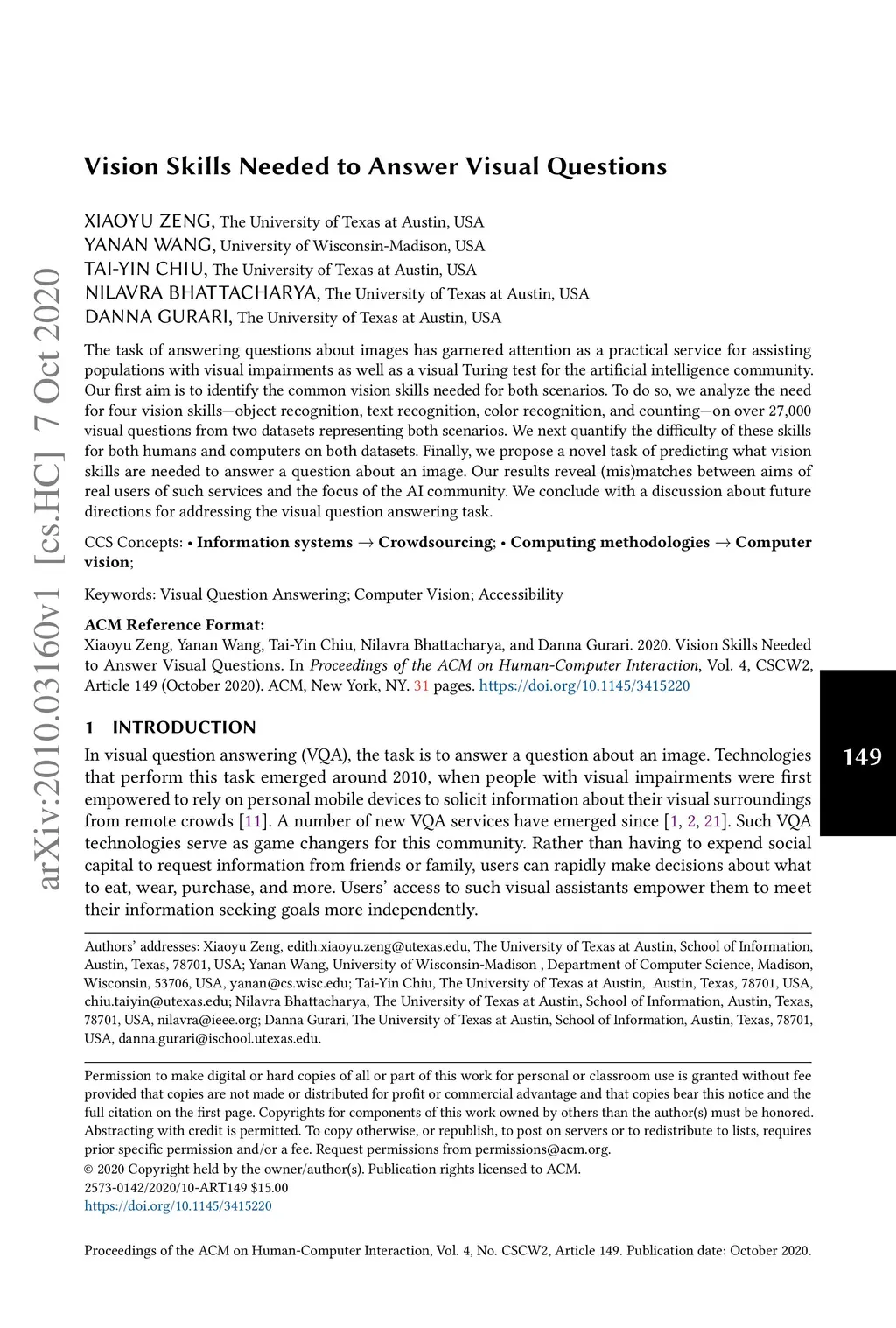 The task of answering questions about images has garnered attention as a practical service for assisting populations with visual impairments as well as a visual Turing test for the artificial intelligence community. Our first aim is to identify the common vision skills needed for both scenarios. To do so, we analyze the need for four vision skills---object recognition, text recognition, color recognition, and counting---on over 27,000 visual questions from two datasets representing both scenarios. We next quantify the difficulty of these skills for both humans and computers on both datasets. Finally, we propose a novel task of predicting what vision skills are needed to answer a question about an image. Our results reveal (mis)matches between aims of real users of such services and the focus of the AI community. We conclude with a discussion about future directions for addressing the visual question answering task.