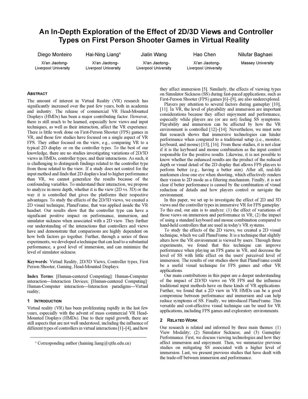 The amount of interest in Virtual Reality (VR) research has significantly increased over the past few years, both in academia and industry. The release of commercial VR Head-Mounted Displays (HMDs) has been a major contributing factor. However, there is still much to be learned, especially how views and input techniques, as well as their interaction, affect the VR experience. There is little work done on First-Person Shooter (FPS) games in VR, and those few studies have focused on a single aspect of VR FPS. They either focused on the view, e.g., comparing VR to a typical 2D display or on the controller types. To the best of our knowledge, there are no studies investigating variations of 2D/3D views in HMDs, controller types, and their interactions. As such, it is challenging to distinguish findings related to the controller type from those related to the view. If a study does not control for the input method and finds that 2D displays lead to higher performance than VR, we cannot generalize the results because of the confounding variables. To understand their interaction, we propose to analyze in more depth, whether it is the view (2D vs. 3D) or the way it is controlled that gives the platforms their respective advantages. To study the effects of the 2D/3D views, we created a 2D visual technique, PlaneFrame, that was applied inside the VR headset. Our results show that the controller type can have a significant positive impact on performance, immersion, and simulator sickness when associated with a 2D view. They further our understanding of the interactions that controllers and views have and demonstrate that comparisons are highly dependent on how both factors go together. Further, through a series of three experiments, we developed a technique that can lead to a substantial performance, a good level of immersion, and can minimize the level of simulator sickness.
