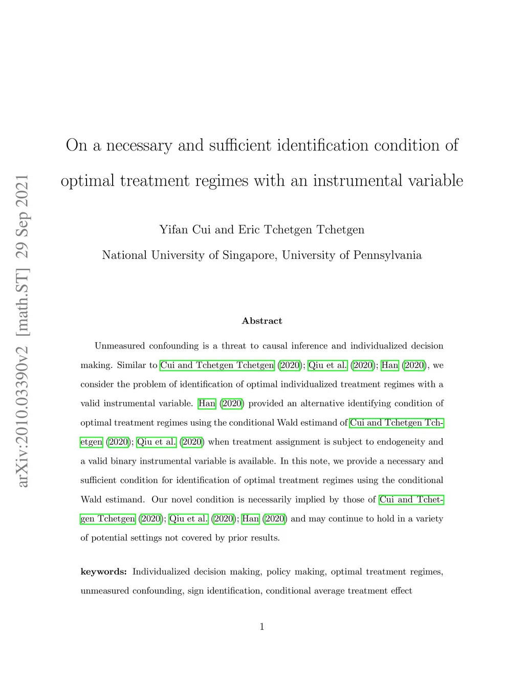 Unmeasured confounding is a threat to causal inference and individualized decision making. Similar to Cui and Tchetgen Tchetgen (2020); Qiu et al. (2020); Han (2020a), we consider the problem of identification of optimal individualized treatment regimes with a valid instrumental variable. Han (2020a) provided an alternative identifying condition of optimal treatment regimes using the conditional Wald estimand of Cui and Tchetgen Tchetgen (2020); Qiu et al. (2020) when treatment assignment is subject to endogeneity and a valid binary instrumental variable is available. In this note, we provide a necessary and sufficient condition for identification of optimal treatment regimes using the conditional Wald estimand. Our novel condition is necessarily implied by those of Cui and Tchetgen Tchetgen (2020); Qiu et al. (2020); Han (2020a) and may continue to hold in a variety of potential settings not covered by prior results.