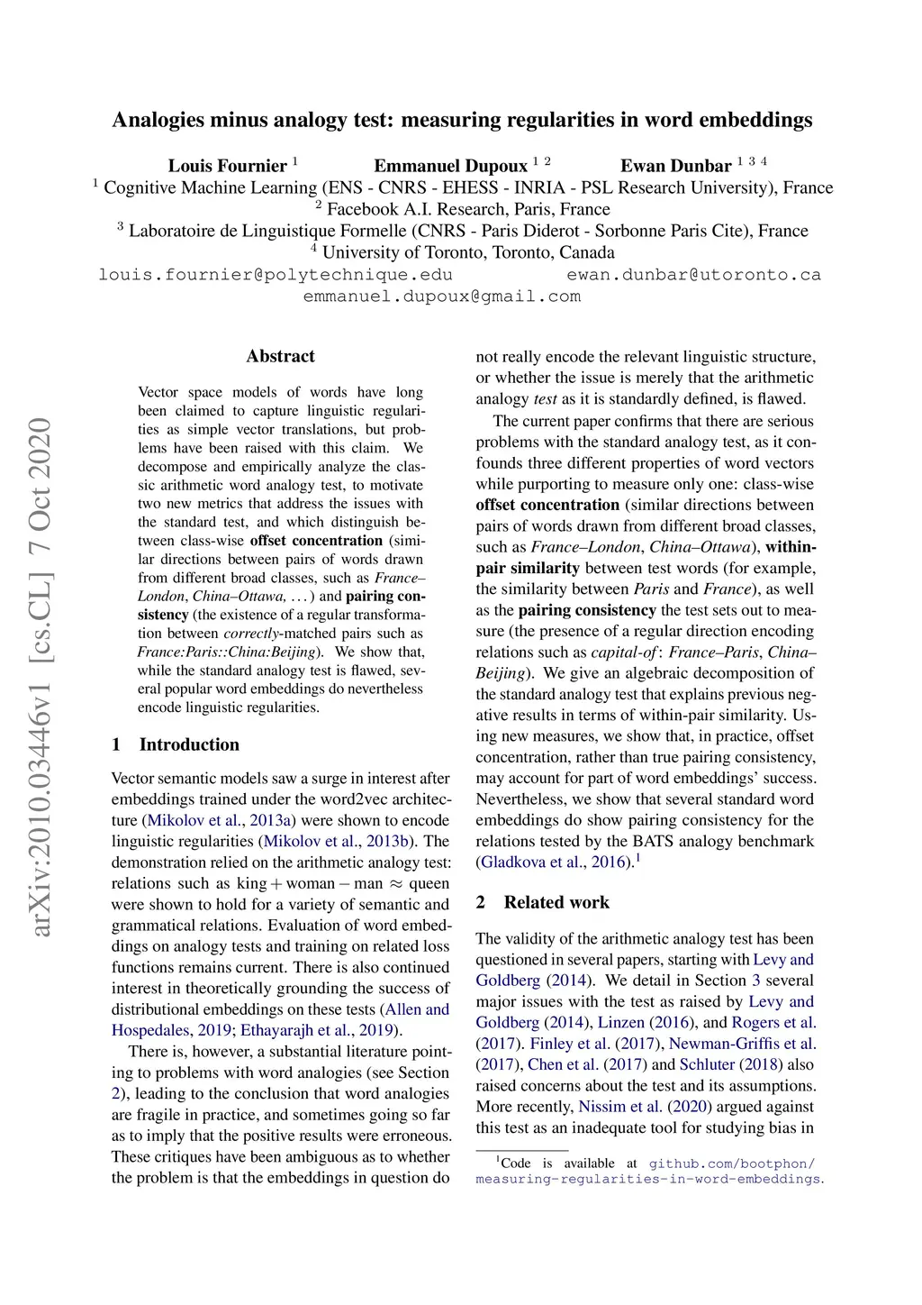 Vector space models of words have long been claimed to capture linguistic regularities as simple vector translations, but problems have been raised with this claim. We decompose and empirically analyze the classic arithmetic word analogy test, to motivate two new metrics that address the issues with the standard test, and which distinguish between class-wise offset concentration (similar directions between pairs of words drawn from different broad classes, such as France--London, China--Ottawa, ...) and pairing consistency (the existence of a regular transformation between correctly-matched pairs such as France:Paris::China:Beijing). We show that, while the standard analogy test is flawed, several popular word embeddings do nevertheless encode linguistic regularities.