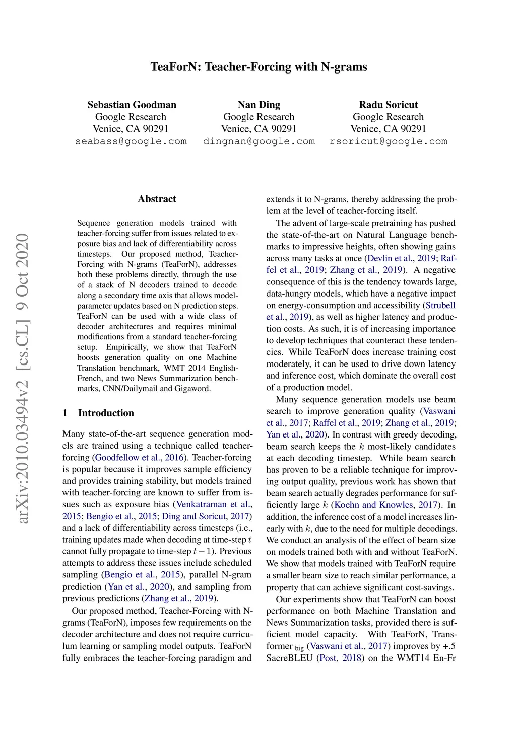 Sequence generation models trained with teacher-forcing suffer from issues related to exposure bias and lack of differentiability across timesteps. Our proposed method, Teacher-Forcing with N-grams (TeaForN), addresses both these problems directly, through the use of a stack of N decoders trained to decode along a secondary time axis that allows model parameter updates based on N prediction steps. TeaForN can be used with a wide class of decoder architectures and requires minimal modifications from a standard teacher-forcing setup. Empirically, we show that TeaForN boosts generation quality on one Machine Translation benchmark, WMT 2014 English-French, and two News Summarization benchmarks, CNN/Dailymail and Gigaword.