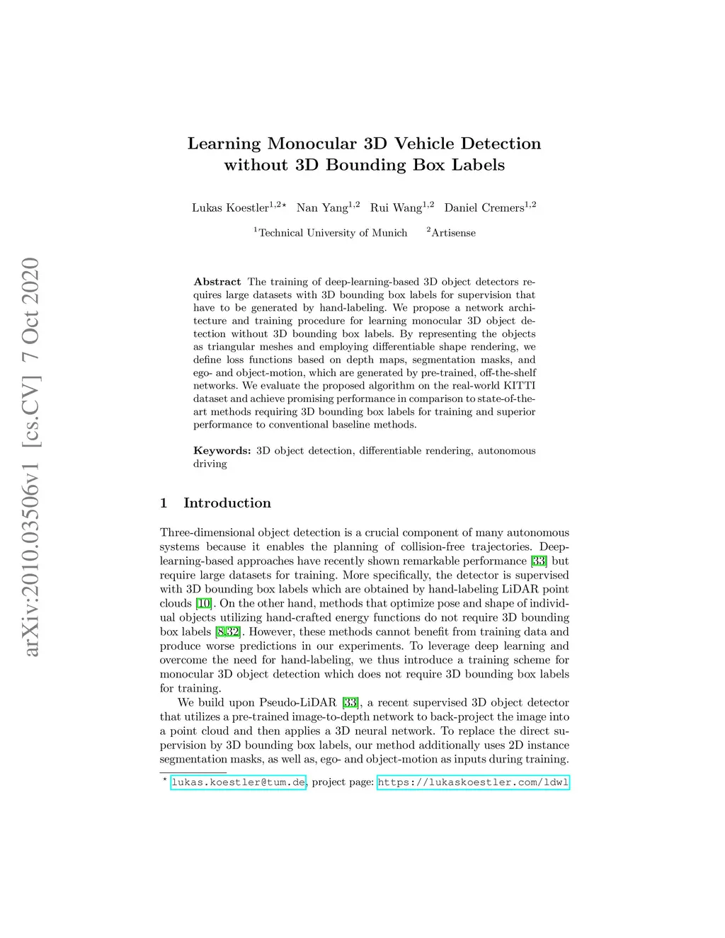 The training of deep-learning-based 3D object detectors requires large datasets with 3D bounding box labels for supervision that have to be generated by hand-labeling. We propose a network architecture and training procedure for learning monocular 3D object detection without 3D bounding box labels. By representing the objects as triangular meshes and employing differentiable shape rendering, we define loss functions based on depth maps, segmentation masks, and ego- and object-motion, which are generated by pre-trained, off-the-shelf networks. We evaluate the proposed algorithm on the real-world KITTI dataset and achieve promising performance in comparison to state-of-the-art methods requiring 3D bounding box labels for training and superior performance to conventional baseline methods.