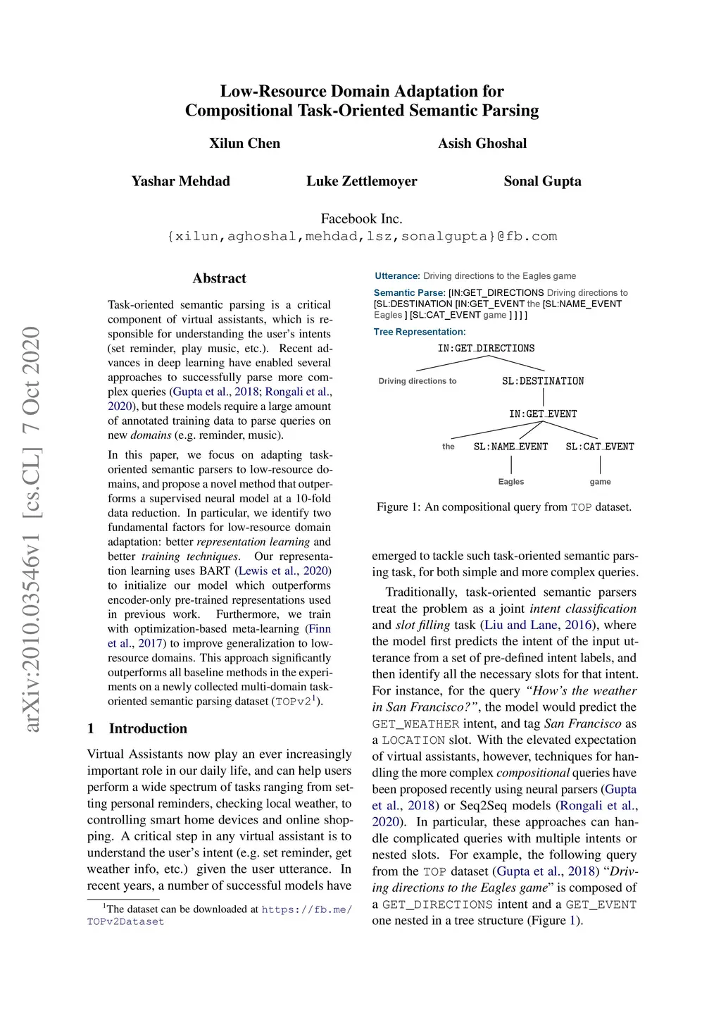 Task-oriented semantic parsing is a critical component of virtual assistants, which is responsible for understanding the user's intents (set reminder, play music, etc.). Recent advances in deep learning have enabled several approaches to successfully parse more complex queries (Gupta et al., 2018; Rongali et al.,2020), but these models require a large amount of annotated training data to parse queries on new domains (e.g. reminder, music). In this paper, we focus on adapting task-oriented semantic parsers to low-resource domains, and propose a novel method that outperforms a supervised neural model at a 10-fold data reduction. In particular, we identify two fundamental factors for low-resource domain adaptation: better representation learning and better training techniques. Our representation learning uses BART (Lewis et al., 2019) to initialize our model which outperforms encoder-only pre-trained representations used in previous work. Furthermore, we train with optimization-based meta-learning (Finn et al., 2017) to improve generalization to low-resource domains. This approach significantly outperforms all baseline methods in the experiments on a newly collected multi-domain task-oriented semantic parsing dataset (TOPv2), which we release to the public.