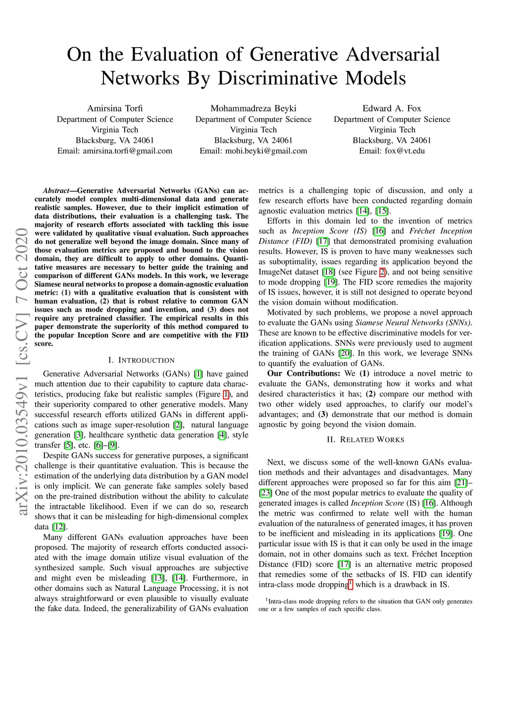 Generative Adversarial Networks (GANs) can accurately model complex multi-dimensional data and generate realistic samples. However, due to their implicit estimation of data distributions, their evaluation is a challenging task. The majority of research efforts associated with tackling this issue were validated by qualitative visual evaluation. Such approaches do not generalize well beyond the image domain. Since many of those evaluation metrics are proposed and bound to the vision domain, they are difficult to apply to other domains. Quantitative measures are necessary to better guide the training and comparison of different GANs models. In this work, we leverage Siamese neural networks to propose a domain-agnostic evaluation metric: (1) with a qualitative evaluation that is consistent with human evaluation, (2) that is robust relative to common GAN issues such as mode dropping and invention, and (3) does not require any pretrained classifier. The empirical results in this paper demonstrate the superiority of this method compared to the popular Inception Score and are competitive with the FID score.