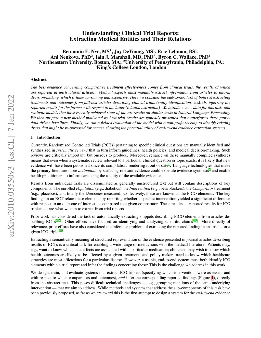 The best evidence concerning comparative treatment effectiveness comes from clinical trials, the results of which are reported in unstructured articles. Medical experts must manually extract information from articles to inform decision-making, which is time-consuming and expensive. Here we consider the end-to-end task of both (a) extracting treatments and outcomes from full-text articles describing clinical trials (entity identification) and, (b) inferring the reported results for the former with respect to the latter (relation extraction). We introduce new data for this task, and evaluate models that have recently achieved state-of-the-art results on similar tasks in Natural Language Processing. We then propose a new method motivated by how trial results are typically presented that outperforms these purely data-driven baselines. Finally, we run a fielded evaluation of the model with a non-profit seeking to identify existing drugs that might be re-purposed for cancer, showing the potential utility of end-to-end evidence extraction systems.