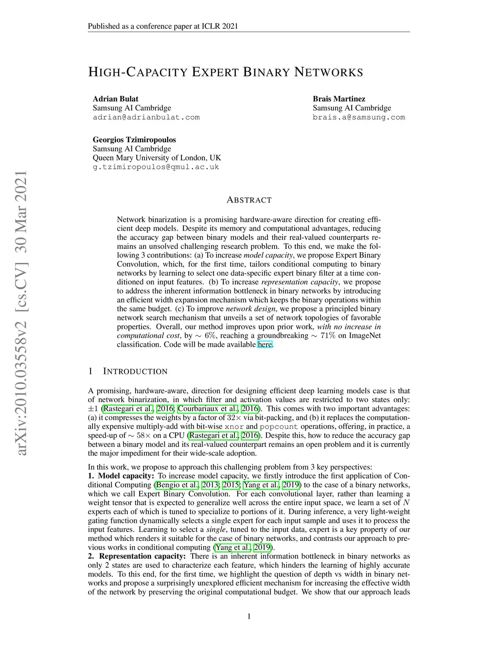 Network binarization is a promising hardware-aware direction for creating efficient deep models. Despite its memory and computational advantages, reducing the accuracy gap between binary models and their real-valued counterparts remains an unsolved challenging research problem. To this end, we make the following 3 contributions: (a) To increase model capacity, we propose Expert Binary Convolution, which, for the first time, tailors conditional computing to binary networks by learning to select one data-specific expert binary filter at a time conditioned on input features. (b) To increase representation capacity, we propose to address the inherent information bottleneck in binary networks by introducing an efficient width expansion mechanism which keeps the binary operations within the same budget. (c) To improve network design, we propose a principled binary network growth mechanism that unveils a set of network topologies of favorable properties. Overall, our method improves upon prior work, with no increase in computational cost, by , reaching a groundbreaking on ImageNet classification. Code will be made available .
