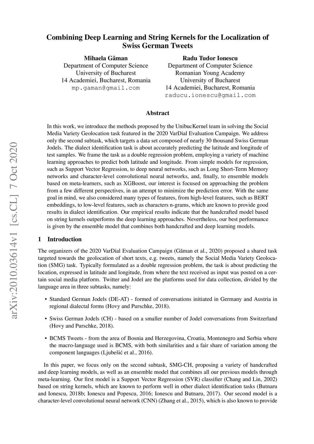 In this work, we introduce the methods proposed by the UnibucKernel team in solving the Social Media Variety Geolocation task featured in the 2020 VarDial Evaluation Campaign. We address only the second subtask, which targets a data set composed of nearly 30 thousand Swiss German Jodels. The dialect identification task is about accurately predicting the latitude and longitude of test samples. We frame the task as a double regression problem, employing a variety of machine learning approaches to predict both latitude and longitude. From simple models for regression, such as Support Vector Regression, to deep neural networks, such as Long Short-Term Memory networks and character-level convolutional neural networks, and, finally, to ensemble models based on meta-learners, such as XGBoost, our interest is focused on approaching the problem from a few different perspectives, in an attempt to minimize the prediction error. With the same goal in mind, we also considered many types of features, from high-level features, such as BERT embeddings, to low-level features, such as characters n-grams, which are known to provide good results in dialect identification. Our empirical results indicate that the handcrafted model based on string kernels outperforms the deep learning approaches. Nevertheless, our best performance is given by the ensemble model that combines both handcrafted and deep learning models.