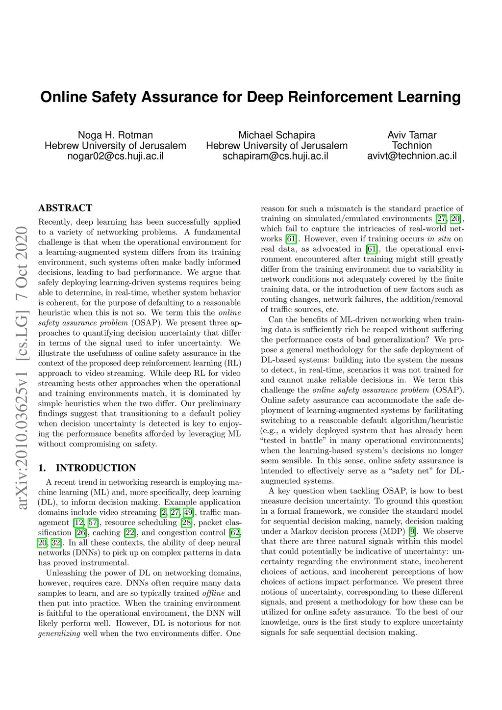 Recently, deep learning has been successfully applied to a variety of networking problems. A fundamental challenge is that when the operational environment for a learning-augmented system differs from its training environment, such systems often make badly informed decisions, leading to bad performance. We argue that safely deploying learning-driven systems requires being able to determine, in real time, whether system behavior is coherent, for the purpose of defaulting to a reasonable heuristic when this is not so. We term this the online safety assurance problem (OSAP). We present three approaches to quantifying decision uncertainty that differ in terms of the signal used to infer uncertainty. We illustrate the usefulness of online safety assurance in the context of the proposed deep reinforcement learning (RL) approach to video streaming. While deep RL for video streaming bests other approaches when the operational and training environments match, it is dominated by simple heuristics when the two differ. Our preliminary findings suggest that transitioning to a default policy when decision uncertainty is detected is key to enjoying the performance benefits afforded by leveraging ML without compromising on safety.