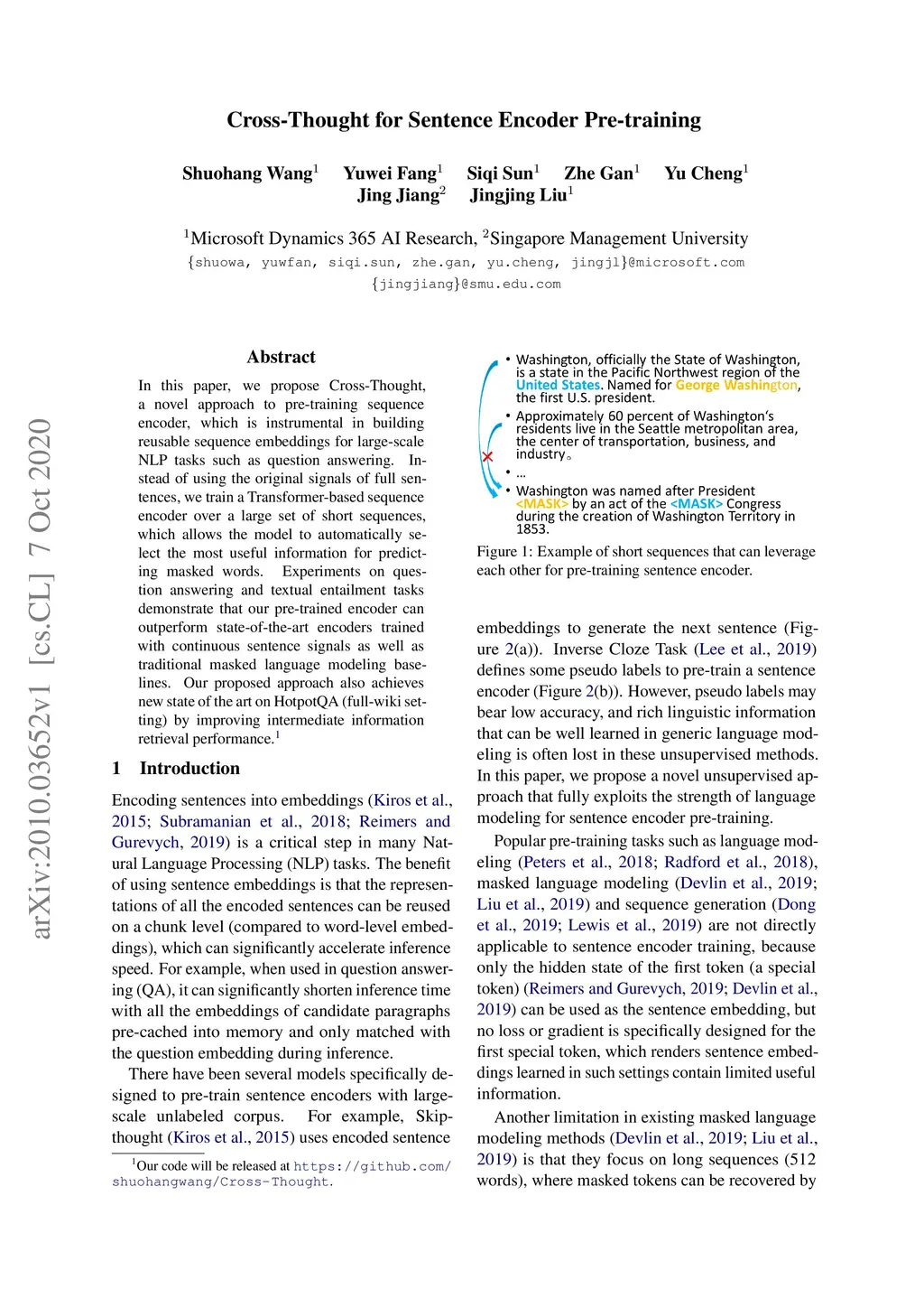 Cross-Thought for Sentence Encoder Pre-training