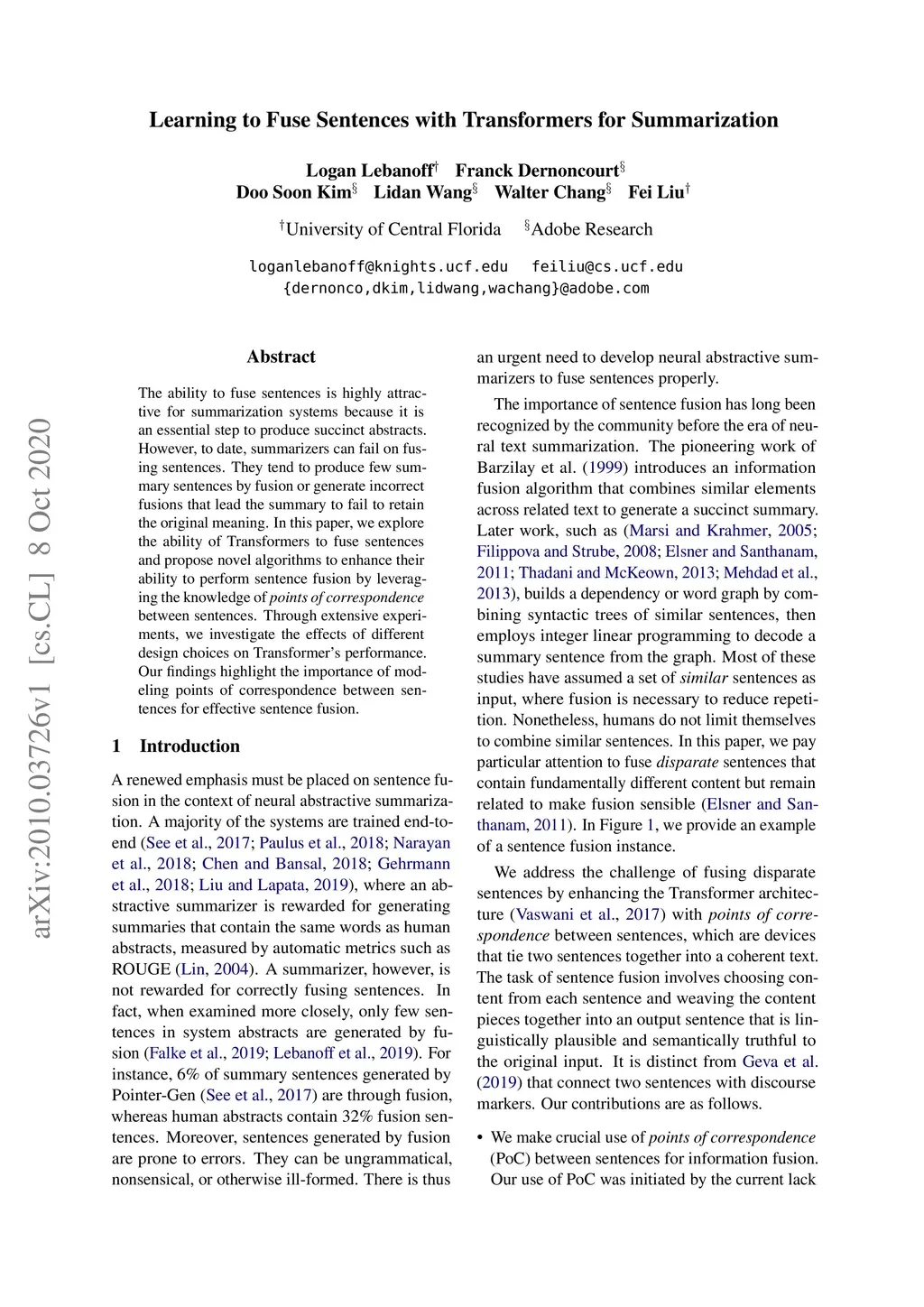 The ability to fuse sentences is highly attractive for summarization systems because it is an essential step to produce succinct abstracts. However, to date, summarizers can fail on fusing sentences. They tend to produce few summary sentences by fusion or generate incorrect fusions that lead the summary to fail to retain the original meaning. In this paper, we explore the ability of Transformers to fuse sentences and propose novel algorithms to enhance their ability to perform sentence fusion by leveraging the knowledge of points of correspondence between sentences. Through extensive experiments, we investigate the effects of different design choices on Transformer's performance. Our findings highlight the importance of modeling points of correspondence between sentences for effective sentence fusion.