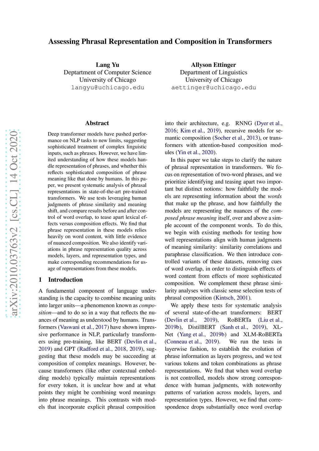 Deep transformer models have pushed performance on NLP tasks to new limits, suggesting sophisticated treatment of complex linguistic inputs, such as phrases. However, we have limited understanding of how these models handle representation of phrases, and whether this reflects sophisticated composition of phrase meaning like that done by humans. In this paper, we present systematic analysis of phrasal representations in state-of-the-art pre-trained transformers. We use tests leveraging human judgments of phrase similarity and meaning shift, and compare results before and after control of word overlap, to tease apart lexical effects versus composition effects. We find that phrase representation in these models relies heavily on word content, with little evidence of nuanced composition. We also identify variations in phrase representation quality across models, layers, and representation types, and make corresponding recommendations for usage of representations from these models.