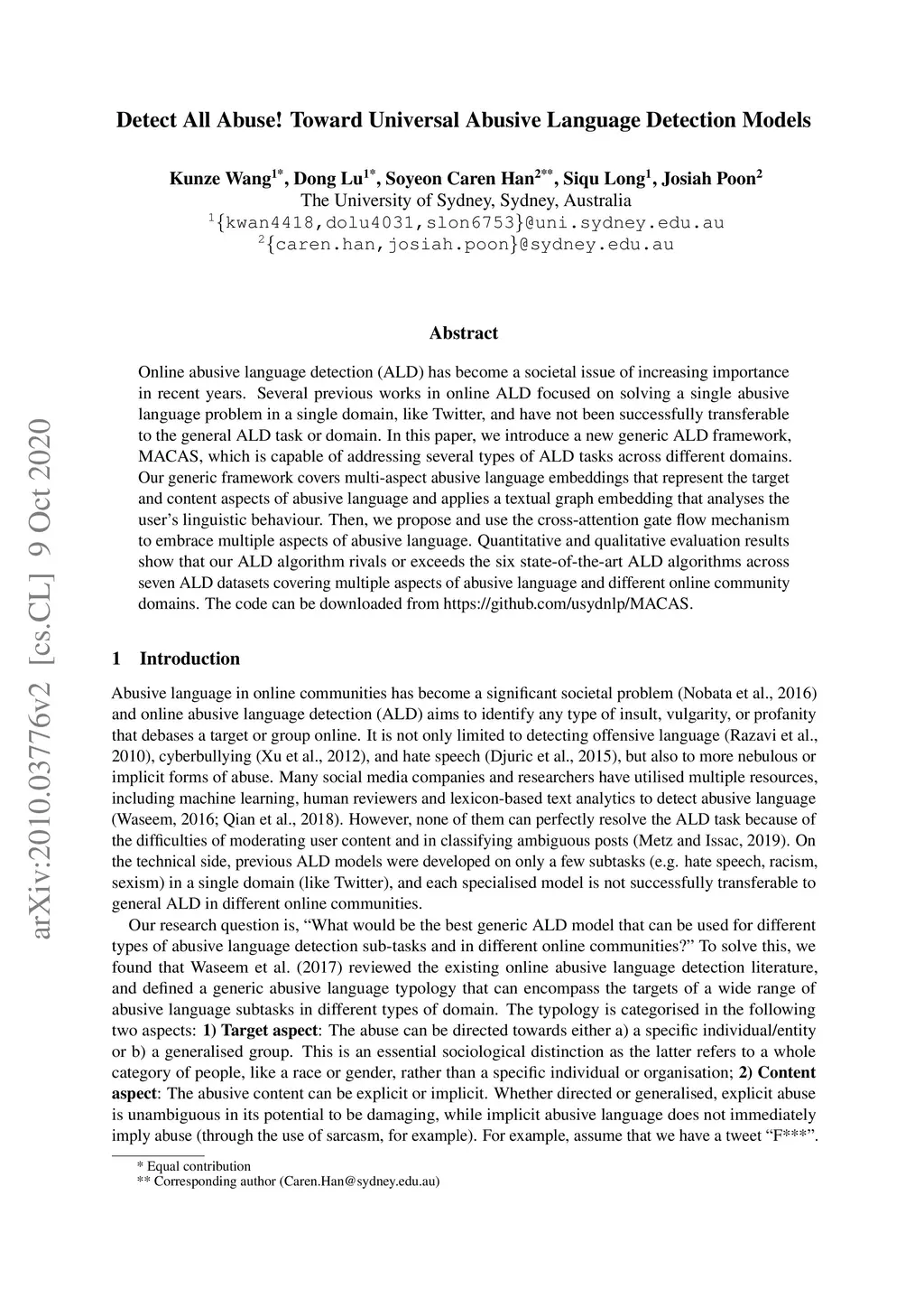 Online abusive language detection (ALD) has become a societal issue of increasing importance in recent years. Several previous works in online ALD focused on solving a single abusive language problem in a single domain, like Twitter, and have not been successfully transferable to the general ALD task or domain. In this paper, we introduce a new generic ALD framework, MACAS, which is capable of addressing several types of ALD tasks across different domains. Our generic framework covers multi-aspect abusive language embeddings that represent the target and content aspects of abusive language and applies a textual graph embedding that analyses the user's linguistic behaviour. Then, we propose and use the cross-attention gate flow mechanism to embrace multiple aspects of abusive language. Quantitative and qualitative evaluation results show that our ALD algorithm rivals or exceeds the six state-of-the-art ALD algorithms across seven ALD datasets covering multiple aspects of abusive language and different online community domains.