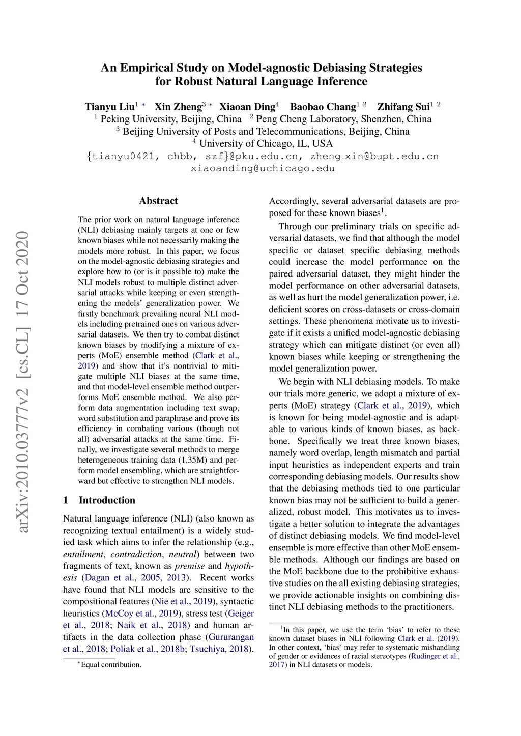 The prior work on natural language inference (NLI) debiasing mainly targets at one or few known biases while not necessarily making the models more robust. In this paper, we focus on the model-agnostic debiasing strategies and explore how to (or is it possible to) make the NLI models robust to multiple distinct adversarial attacks while keeping or even strengthening the models' generalization power. We firstly benchmark prevailing neural NLI models including pretrained ones on various adversarial datasets. We then try to combat distinct known biases by modifying a mixture of experts (MoE) ensemble method and show that it's nontrivial to mitigate multiple NLI biases at the same time, and that model-level ensemble method outperforms MoE ensemble method. We also perform data augmentation including text swap, word substitution and paraphrase and prove its efficiency in combating various (though not all) adversarial attacks at the same time. Finally, we investigate several methods to merge heterogeneous training data (1.35M) and perform model ensembling, which are straightforward but effective to strengthen NLI models.