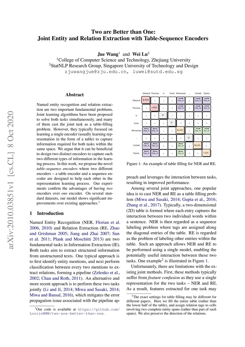Named entity recognition and relation extraction are two important fundamental problems. Joint learning algorithms have been proposed to solve both tasks simultaneously, and many of them cast the joint task as a table-filling problem. However, they typically focused on learning a single encoder (usually learning representation in the form of a table) to capture information required for both tasks within the same space. We argue that it can be beneficial to design two distinct encoders to capture such two different types of information in the learning process. In this work, we propose the novel {\em table-sequence encoders} where two different encoders -- a table encoder and a sequence encoder are designed to help each other in the representation learning process. Our experiments confirm the advantages of having {\em two} encoders over {\em one} encoder. On several standard datasets, our model shows significant improvements over existing approaches.