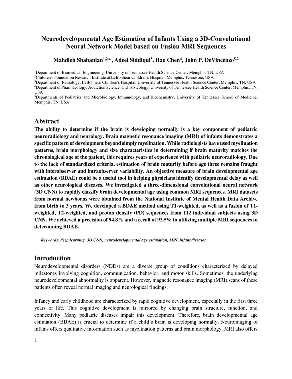 The ability to determine if the brain is developing normally is a key component of pediatric neuroradiology and neurology. Brain magnetic resonance imaging (MRI) of infants demonstrates a specific pattern of development beyond simply myelination. While radiologists have used myelination patterns, brain morphology and size characteristics in determining if brain maturity matches the chronological age of the patient, this requires years of experience with pediatric neuroradiology. Due to the lack of standardized criteria, estimation of brain maturity before age three remains fraught with interobserver and intraobserver variability. An objective measure of brain developmental age estimation (BDAE) could be a useful tool in helping physicians identify developmental delay as well as other neurological diseases. We investigated a three-dimensional convolutional neural network (3D CNN) to rapidly classify brain developmental age using common MRI sequences. MRI datasets from normal newborns were obtained from the National Institute of Mental Health Data Archive from birth to 3 years. We developed a BDAE method using T1-weighted, as well as a fusion of T1-weighted, T2-weighted, and proton density (PD) sequences from 112 individual subjects using 3D CNN. We achieved a precision of 94.8% and a recall of 93.5% in utilizing multiple MRI sequences in determining BDAE.