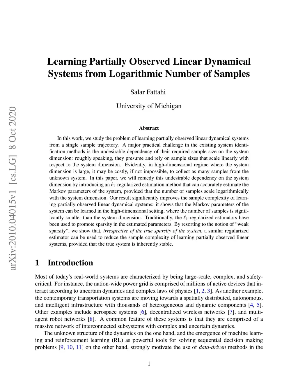 In this work, we study the problem of learning partially observed linear dynamical systems from a single sample trajectory. A major practical challenge in the existing system identification methods is the undesirable dependency of their required sample size on the system dimension: roughly speaking, they presume and rely on sample sizes that scale linearly with respect to the system dimension. Evidently, in high-dimensional regime where the system dimension is large, it may be costly, if not impossible, to collect as many samples from the unknown system. In this paper, we will remedy this undesirable dependency on the system dimension by introducing an -regularized estimation method that can accurately estimate the Markov parameters of the system, provided that the number of samples scale logarithmically with the system dimension. Our result significantly improves the sample complexity of learning partially observed linear dynamical systems: it shows that the Markov parameters of the system can be learned in the high-dimensional setting, where the number of samples is significantly smaller than the system dimension. Traditionally, the -regularized estimators have been used to promote sparsity in the estimated parameters. By resorting to the notion of "weak sparsity", we show that, irrespective of the true sparsity of the system, a similar regularized estimator can be used to reduce the sample complexity of learning partially observed linear systems, provided that the true system is inherently stable.