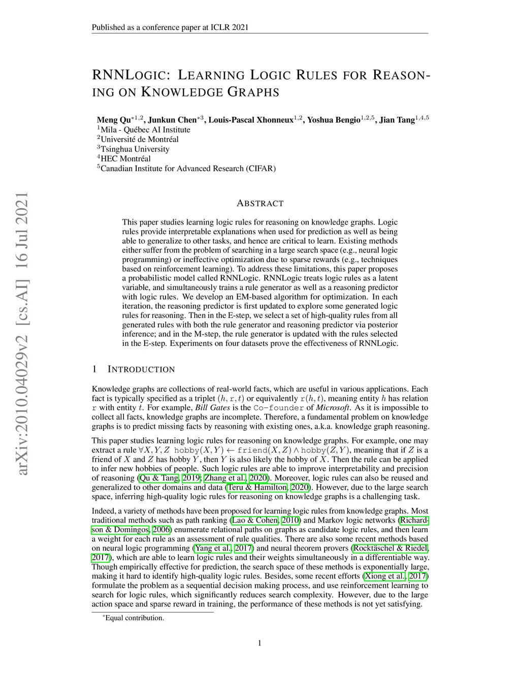 This paper studies learning logic rules for reasoning on knowledge graphs. Logic rules provide interpretable explanations when used for prediction as well as being able to generalize to other tasks, and hence are critical to learn. Existing methods either suffer from the problem of searching in a large search space (e.g., neural logic programming) or ineffective optimization due to sparse rewards (e.g., techniques based on reinforcement learning). To address these limitations, this paper proposes a probabilistic model called RNNLogic. RNNLogic treats logic rules as a latent variable, and simultaneously trains a rule generator as well as a reasoning predictor with logic rules. We develop an EM-based algorithm for optimization. In each iteration, the reasoning predictor is first updated to explore some generated logic rules for reasoning. Then in the E-step, we select a set of high-quality rules from all generated rules with both the rule generator and reasoning predictor via posterior inference; and in the M-step, the rule generator is updated with the rules selected in the E-step. Experiments on four datasets prove the effectiveness of RNNLogic.