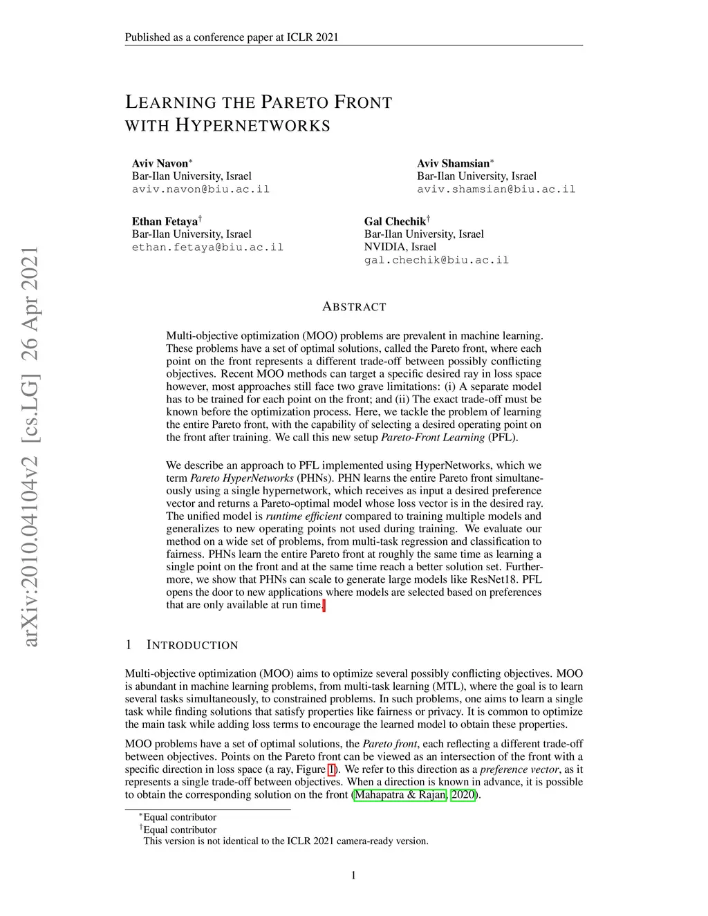 Multi-objective optimization (MOO) problems are prevalent in machine learning. These problems have a set of optimal solutions, called the Pareto front, where each point on the front represents a different trade-off between possibly conflicting objectives. Recent MOO methods can target a specific desired ray in loss space however, most approaches still face two grave limitations: (i) A separate model has to be trained for each point on the front; and (ii) The exact trade-off must be known before the optimization process. Here, we tackle the problem of learning the entire Pareto front, with the capability of selecting a desired operating point on the front after training. We call this new setup Pareto-Front Learning (PFL). We describe an approach to PFL implemented using HyperNetworks, which we term Pareto HyperNetworks (PHNs). PHN learns the entire Pareto front simultaneously using a single hypernetwork, which receives as input a desired preference vector and returns a Pareto-optimal model whose loss vector is in the desired ray. The unified model is runtime efficient compared to training multiple models and generalizes to new operating points not used during training. We evaluate our method on a wide set of problems, from multi-task regression and classification to fairness. PHNs learn the entire Pareto front at roughly the same time as learning a single point on the front and at the same time reach a better solution set. Furthermore, we show that PHNs can scale to generate large models like ResNet18. PFL opens the door to new applications where models are selected based on preferences that are only available at run time.