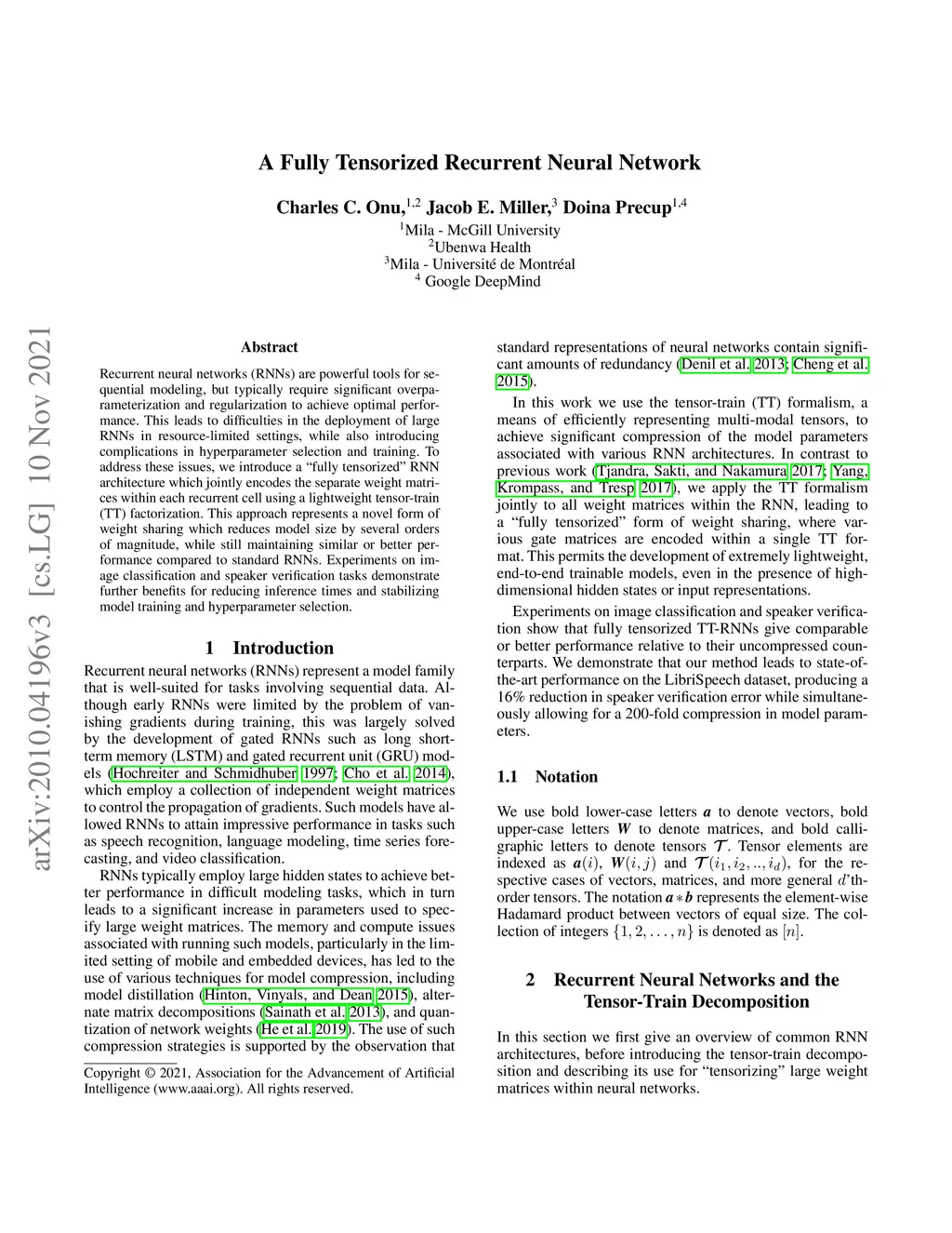 Recurrent neural networks (RNNs) are powerful tools for sequential modeling, but typically require significant overparameterization and regularization to achieve optimal performance. This leads to difficulties in the deployment of large RNNs in resource-limited settings, while also introducing complications in hyperparameter selection and training. To address these issues, we introduce a "fully tensorized" RNN architecture which jointly encodes the separate weight matrices within each recurrent cell using a lightweight tensor-train (TT) factorization. This approach represents a novel form of weight sharing which reduces model size by several orders of magnitude, while still maintaining similar or better performance compared to standard RNNs. Experiments on image classification and speaker verification tasks demonstrate further benefits for reducing inference times and stabilizing model training and hyperparameter selection.