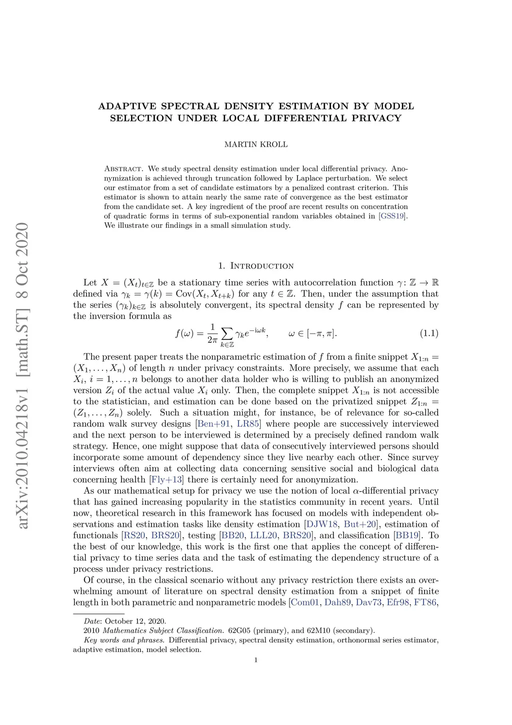 We study spectral density estimation under local differential privacy. Anonymization is achieved through truncation followed by Laplace perturbation. We select our estimator from a set of candidate estimators by a penalized contrast criterion. This estimator is shown to attain nearly the same rate of convergence as the best estimator from the candidate set. A key ingredient of the proof are recent results on concentration of quadratic forms in terms of sub-exponential random variables obtained in arXiv:1903.05964. We illustrate our findings in a small simulation study.