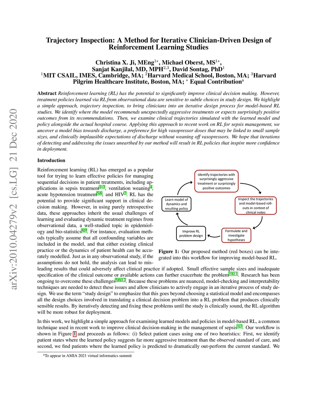 Reinforcement learning (RL) has the potential to significantly improve clinical decision making. However, treatment policies learned via RL from observational data are sensitive to subtle choices in study design. We highlight a simple approach, trajectory inspection, to bring clinicians into an iterative design process for model-based RL studies. We identify where the model recommends unexpectedly aggressive treatments or expects surprisingly positive outcomes from its recommendations. Then, we examine clinical trajectories simulated with the learned model and policy alongside the actual hospital course. Applying this approach to recent work on RL for sepsis management, we uncover a model bias towards discharge, a preference for high vasopressor doses that may be linked to small sample sizes, and clinically implausible expectations of discharge without weaning off vasopressors. We hope that iterations of detecting and addressing the issues unearthed by our method will result in RL policies that inspire more confidence in deployment.