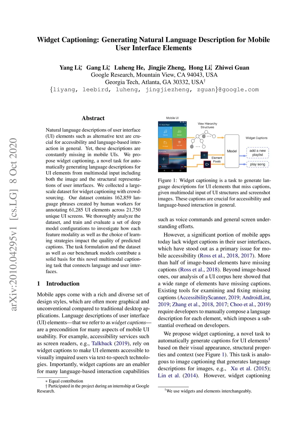 Widget Captioning: Generating Natural Language Description for Mobile