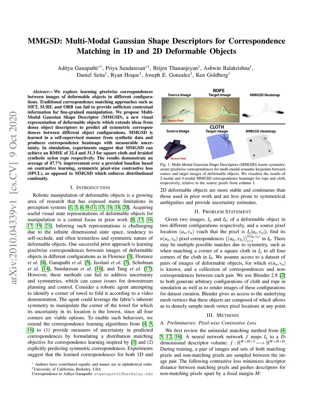 We explore learning pixelwise correspondences between images of deformable objects in different configurations. Traditional correspondence matching approaches such as SIFT, SURF, and ORB can fail to provide sufficient contextual information for fine-grained manipulation. We propose Multi-Modal Gaussian Shape Descriptor (MMGSD), a new visual representation of deformable objects which extends ideas from dense object descriptors to predict all symmetric correspondences between different object configurations. MMGSD is learned in a self-supervised manner from synthetic data and produces correspondence heatmaps with measurable uncertainty. In simulation, experiments suggest that MMGSD can achieve an RMSE of 32.4 and 31.3 for square cloth and braided synthetic nylon rope respectively. The results demonstrate an average of 47.7% improvement over a provided baseline based on contrastive learning, symmetric pixel-wise contrastive loss (SPCL), as opposed to MMGSD which enforces distributional continuity.