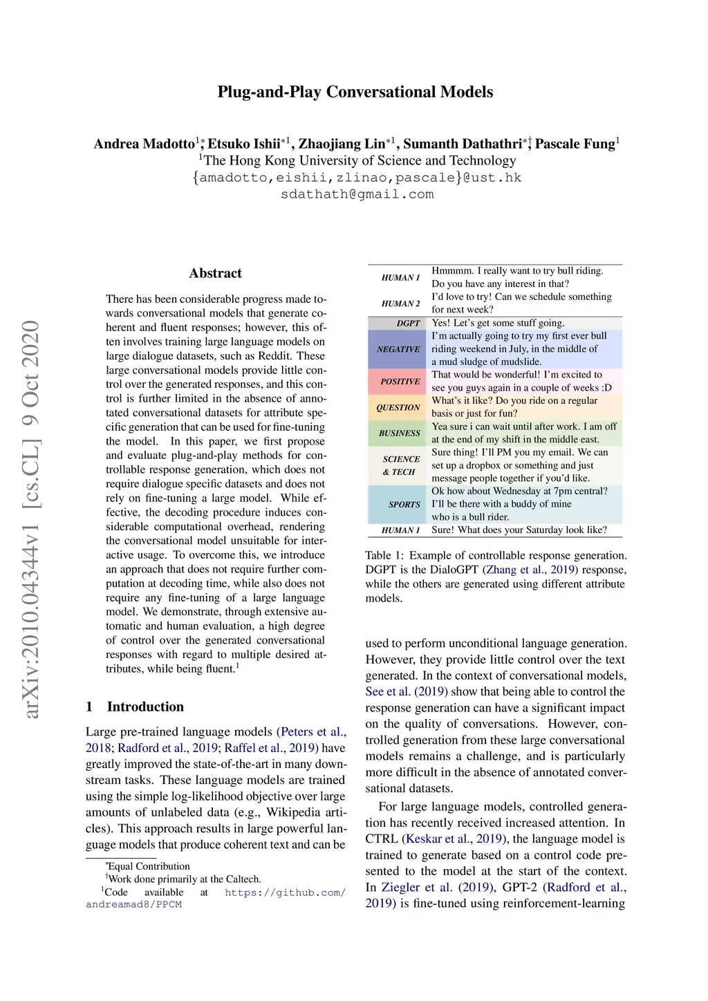 There has been considerable progress made towards conversational models that generate coherent and fluent responses; however, this often involves training large language models on large dialogue datasets, such as Reddit. These large conversational models provide little control over the generated responses, and this control is further limited in the absence of annotated conversational datasets for attribute specific generation that can be used for fine-tuning the model. In this paper, we first propose and evaluate plug-and-play methods for controllable response generation, which does not require dialogue specific datasets and does not rely on fine-tuning a large model. While effective, the decoding procedure induces considerable computational overhead, rendering the conversational model unsuitable for interactive usage. To overcome this, we introduce an approach that does not require further computation at decoding time, while also does not require any fine-tuning of a large language model. We demonstrate, through extensive automatic and human evaluation, a high degree of control over the generated conversational responses with regard to multiple desired attributes, while being fluent.