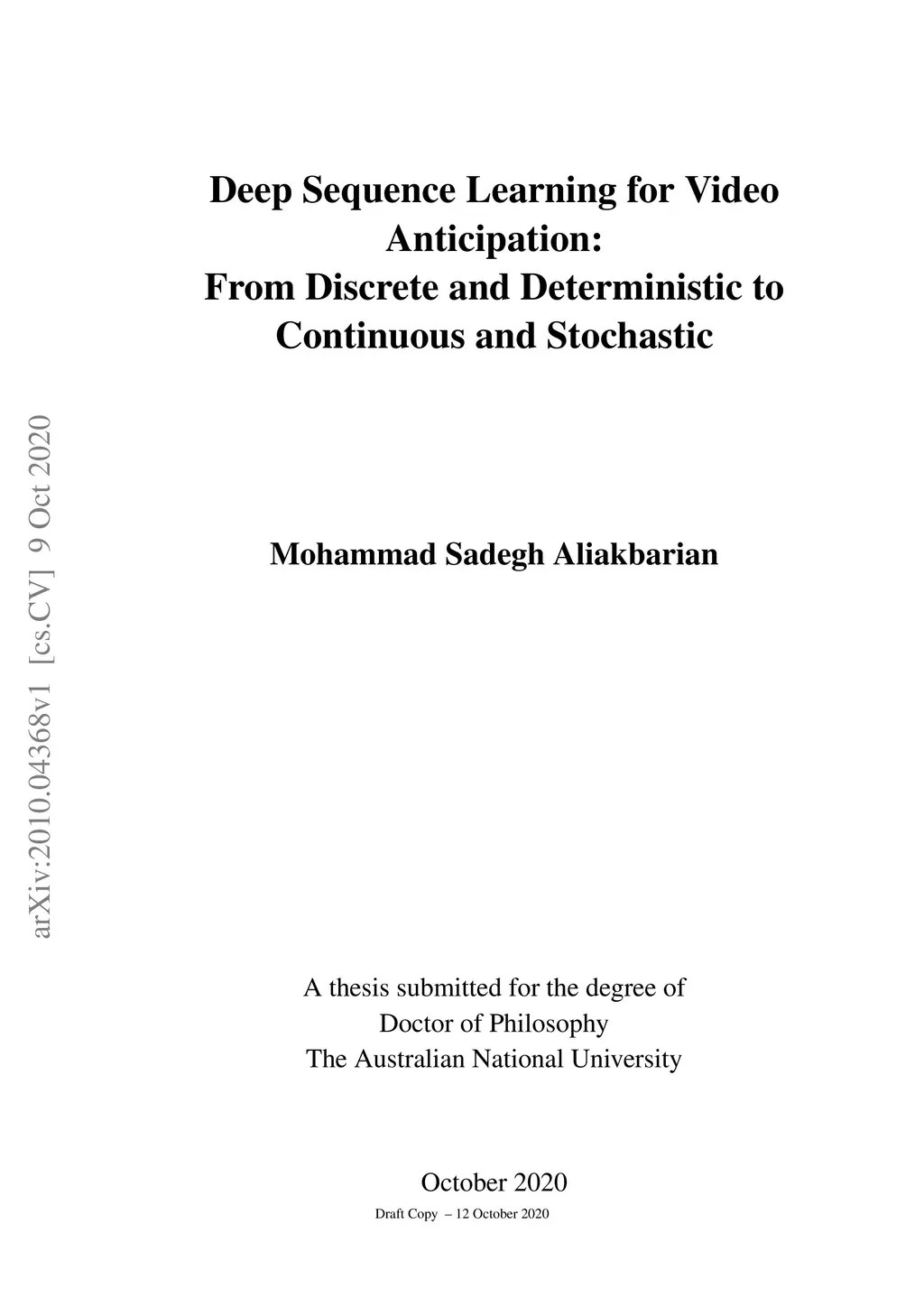 Video anticipation is the task of predicting one/multiple future representation(s) given limited, partial observation. This is a challenging task due to the fact that given limited observation, the future representation can be highly ambiguous. Based on the nature of the task, video anticipation can be considered from two viewpoints: the level of details and the level of determinism in the predicted future. In this research, we start from anticipating a coarse representation of a deterministic future and then move towards predicting continuous and fine-grained future representations of a stochastic process. The example of the former is video action anticipation in which we are interested in predicting one action label given a partially observed video and the example of the latter is forecasting multiple diverse continuations of human motion given partially observed one. In particular, in this thesis, we make several contributions to the literature of video anticipation...