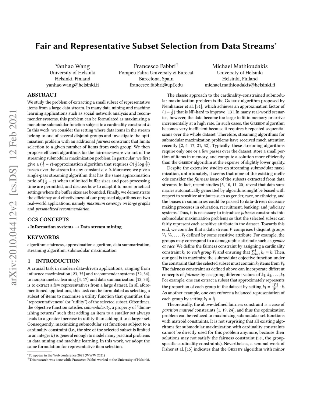 We study the problem of extracting a small subset of representative items from a large data stream. In many data mining and machine learning applications such as social network analysis and recommender systems, this problem can be formulated as maximizing a monotone submodular function subject to a cardinality constraint . In this work, we consider the setting where data items in the stream belong to one of several disjoint groups and investigate the optimization problem with an additional \emph{fairness} constraint that limits selection to a given number of items from each group. We then propose efficient algorithms for the fairness-aware variant of the streaming submodular maximization problem. In particular, we first give a $ (\frac{1}{2}-\varepsilon) $-approximation algorithm that requires $ O(\frac{1}{\varepsilon} \log \frac{k}{\varepsilon}) $ passes over the stream for any constant $ \varepsilon>0 $. Moreover, we give a single-pass streaming algorithm that has the same approximation ratio of when unlimited buffer sizes and post-processing time are permitted, and discuss how to adapt it to more practical settings where the buffer sizes are bounded. Finally, we demonstrate the efficiency and effectiveness of our proposed algorithms on two real-world applications, namely \emph{maximum coverage on large graphs} and \emph{personalized recommendation}.