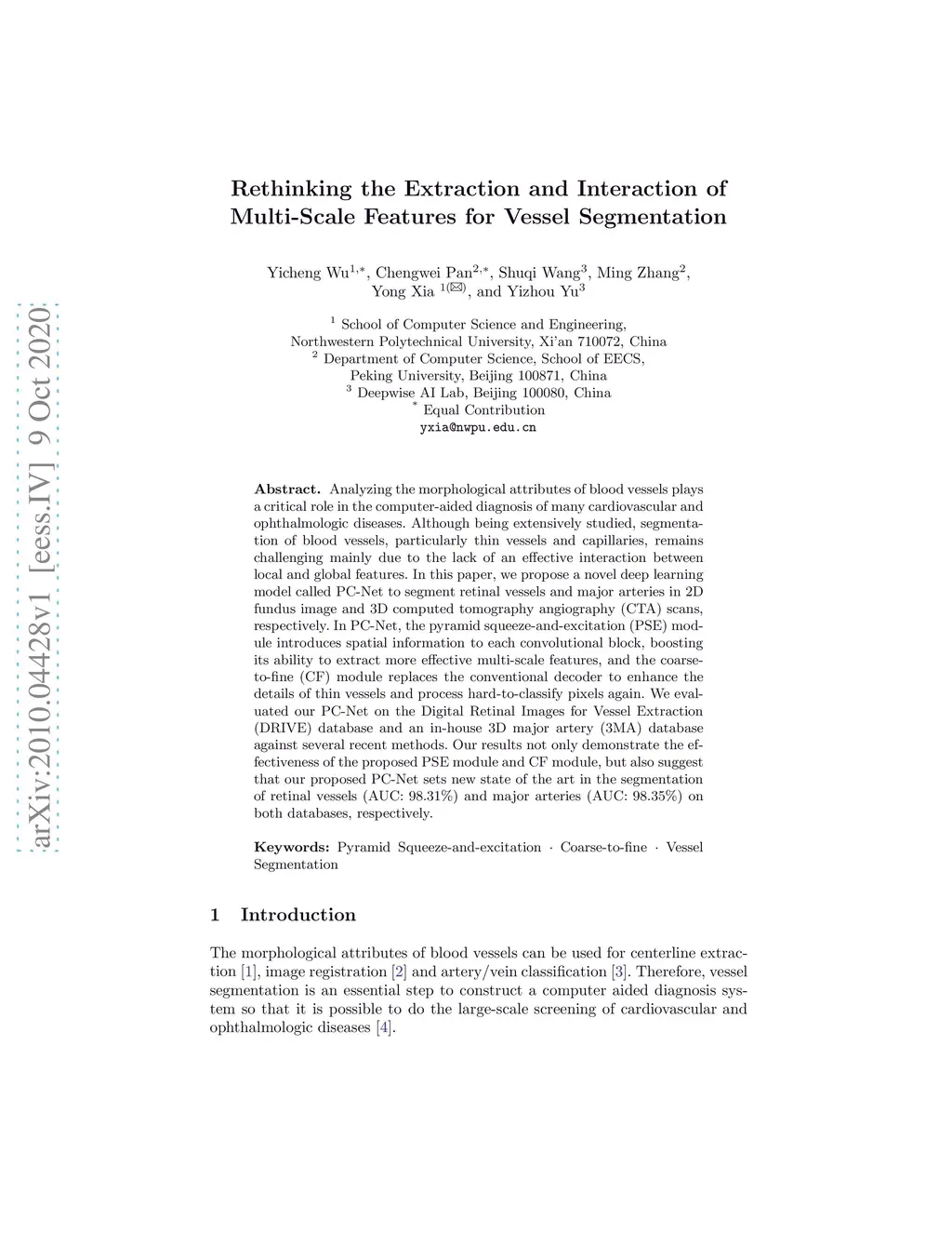 Analyzing the morphological attributes of blood vessels plays a critical role in the computer-aided diagnosis of many cardiovascular and ophthalmologic diseases. Although being extensively studied, segmentation of blood vessels, particularly thin vessels and capillaries, remains challenging mainly due to the lack of an effective interaction between local and global features. In this paper, we propose a novel deep learning model called PC-Net to segment retinal vessels and major arteries in 2D fundus image and 3D computed tomography angiography (CTA) scans, respectively. In PC-Net, the pyramid squeeze-and-excitation (PSE) module introduces spatial information to each convolutional block, boosting its ability to extract more effective multi-scale features, and the coarse-to-fine (CF) module replaces the conventional decoder to enhance the details of thin vessels and process hard-to-classify pixels again. We evaluated our PC-Net on the Digital Retinal Images for Vessel Extraction (DRIVE) database and an in-house 3D major artery (3MA) database against several recent methods. Our results not only demonstrate the effectiveness of the proposed PSE module and CF module, but also suggest that our proposed PC-Net sets new state of the art in the segmentation of retinal vessels (AUC: 98.31%) and major arteries (AUC: 98.35%) on both databases, respectively.