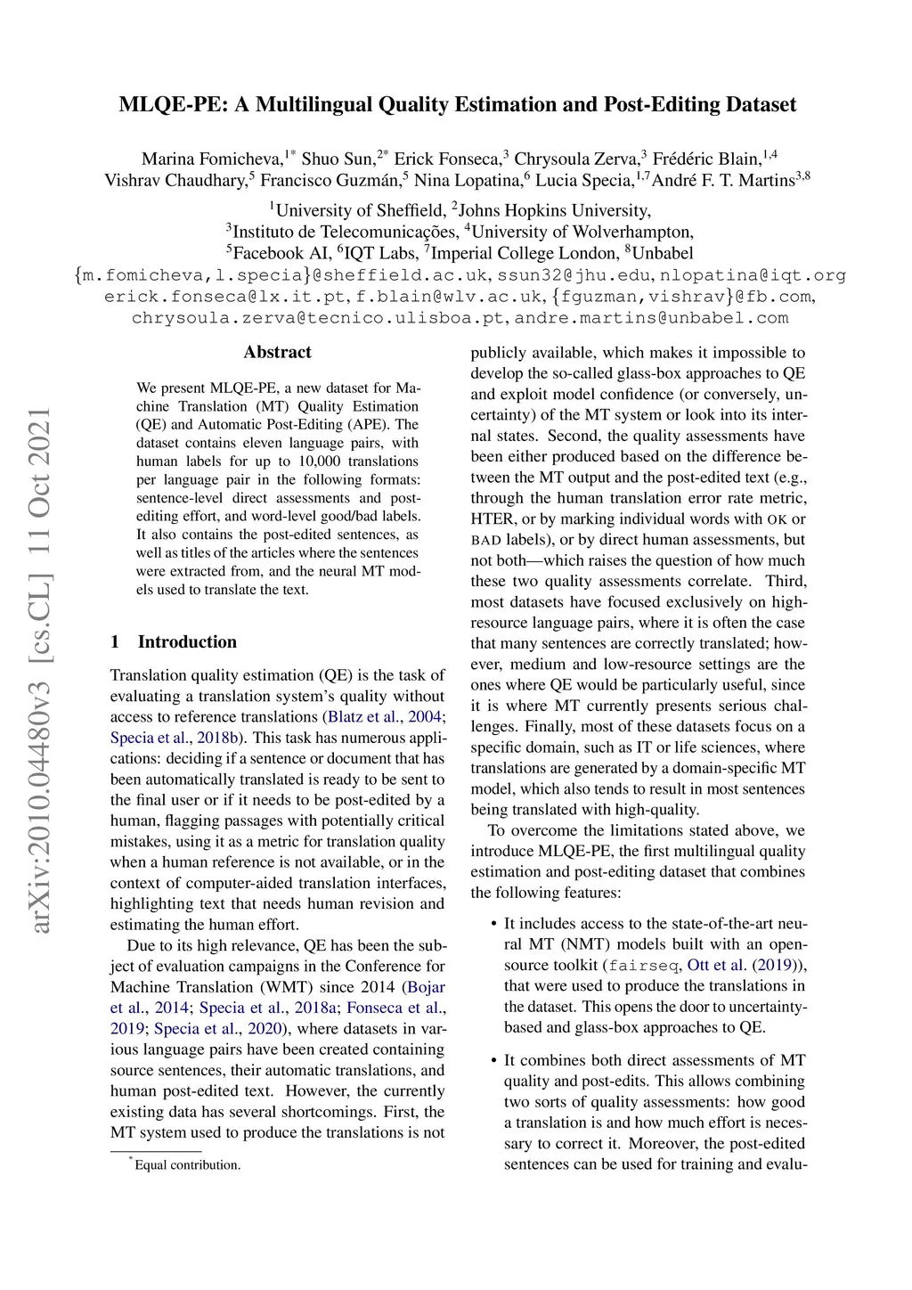 We present MLQE-PE, a new dataset for Machine Translation (MT) Quality Estimation (QE) and Automatic Post-Editing (APE). The dataset contains eleven language pairs, with human labels for up to 10,000 translations per language pair in the following formats: sentence-level direct assessments and post-editing effort, and word-level good/bad labels. It also contains the post-edited sentences, as well as titles of the articles where the sentences were extracted from, and the neural MT models used to translate the text.