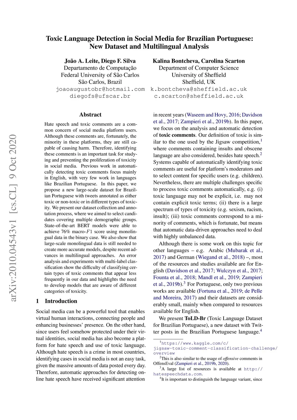 Hate speech and toxic comments are a common concern of social media platform users. Although these comments are, fortunately, the minority in these platforms, they are still capable of causing harm. Therefore, identifying these comments is an important task for studying and preventing the proliferation of toxicity in social media. Previous work in automatically detecting toxic comments focus mainly in English, with very few work in languages like Brazilian Portuguese. In this paper, we propose a new large-scale dataset for Brazilian Portuguese with tweets annotated as either toxic or non-toxic or in different types of toxicity. We present our dataset collection and annotation process, where we aimed to select candidates covering multiple demographic groups. State-of-the-art BERT models were able to achieve 76% macro-F1 score using monolingual data in the binary case. We also show that large-scale monolingual data is still needed to create more accurate models, despite recent advances in multilingual approaches. An error analysis and experiments with multi-label classification show the difficulty of classifying certain types of toxic comments that appear less frequently in our data and highlights the need to develop models that are aware of different categories of toxicity.