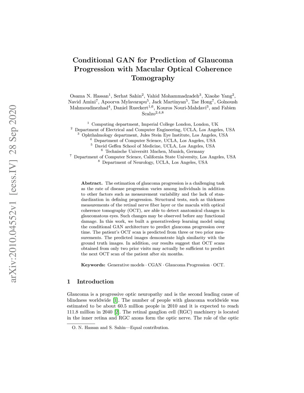 The estimation of glaucoma progression is a challenging task as the rate of disease progression varies among individuals in addition to other factors such as measurement variability and the lack of standardization in defining progression. Structural tests, such as thickness measurements of the retinal nerve fiber layer or the macula with optical coherence tomography (OCT), are able to detect anatomical changes in glaucomatous eyes. Such changes may be observed before any functional damage. In this work, we built a generative deep learning model using the conditional GAN architecture to predict glaucoma progression over time. The patient's OCT scan is predicted from three or two prior measurements. The predicted images demonstrate high similarity with the ground truth images. In addition, our results suggest that OCT scans obtained from only two prior visits may actually be sufficient to predict the next OCT scan of the patient after six months.