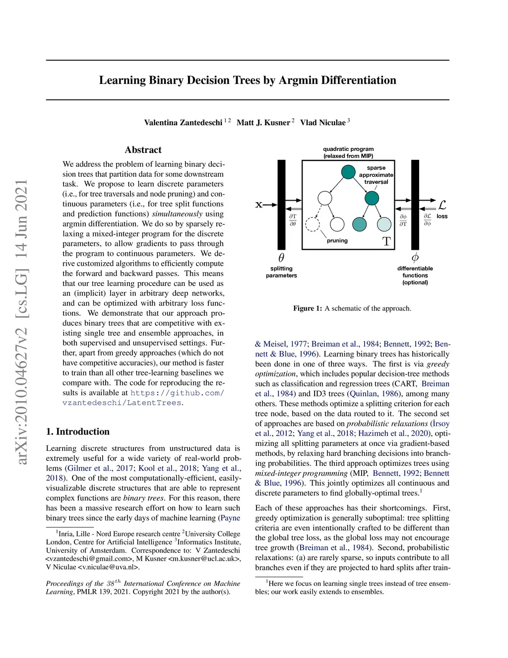 We address the problem of learning binary decision trees that partition data for some downstream task. We propose to learn discrete parameters (i.e., for tree traversals and node pruning) and continuous parameters (i.e., for tree split functions and prediction functions) simultaneously using argmin differentiation. We do so by sparsely relaxing a mixed-integer program for the discrete parameters, to allow gradients to pass through the program to continuous parameters. We derive customized algorithms to efficiently compute the forward and backward passes. This means that our tree learning procedure can be used as an (implicit) layer in arbitrary deep networks, and can be optimized with arbitrary loss functions. We demonstrate that our approach produces binary trees that are competitive with existing single tree and ensemble approaches, in both supervised and unsupervised settings. Further, apart from greedy approaches (which do not have competitive accuracies), our method is faster to train than all other tree-learning baselines we compare with. The code for reproducing the results is available at https://github.com/vzantedeschi/LatentTrees.