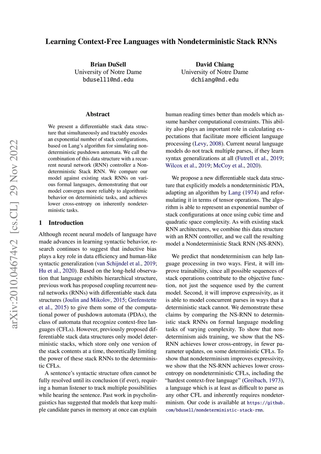 Learning Context-Free Languages with Nondeterministic Stack RNNs