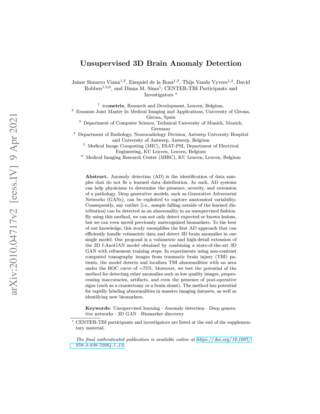 Anomaly detection (AD) is the identification of data samples that do not fit a learned data distribution. As such, AD systems can help physicians to determine the presence, severity, and extension of a pathology. Deep generative models, such as Generative Adversarial Networks (GANs), can be exploited to capture anatomical variability. Consequently, any outlier (i.e., sample falling outside of the learned distribution) can be detected as an abnormality in an unsupervised fashion. By using this method, we can not only detect expected or known lesions, but we can even unveil previously unrecognized biomarkers. To the best of our knowledge, this study exemplifies the first AD approach that can efficiently handle volumetric data and detect 3D brain anomalies in one single model. Our proposal is a volumetric and high-detail extension of the 2D f-AnoGAN model obtained by combining a state-of-the-art 3D GAN with refinement training steps. In experiments using non-contrast computed tomography images from traumatic brain injury (TBI) patients, the model detects and localizes TBI abnormalities with an area under the ROC curve of ~75%. Moreover, we test the potential of the method for detecting other anomalies such as low quality images, preprocessing inaccuracies, artifacts, and even the presence of post-operative signs (such as a craniectomy or a brain shunt). The method has potential for rapidly labeling abnormalities in massive imaging datasets, as well as identifying new biomarkers.