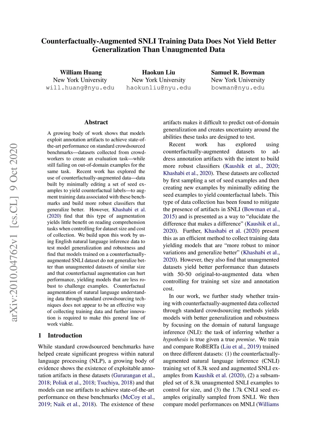 Counterfactually-Augmented SNLI Training Data Does Not Yield Better