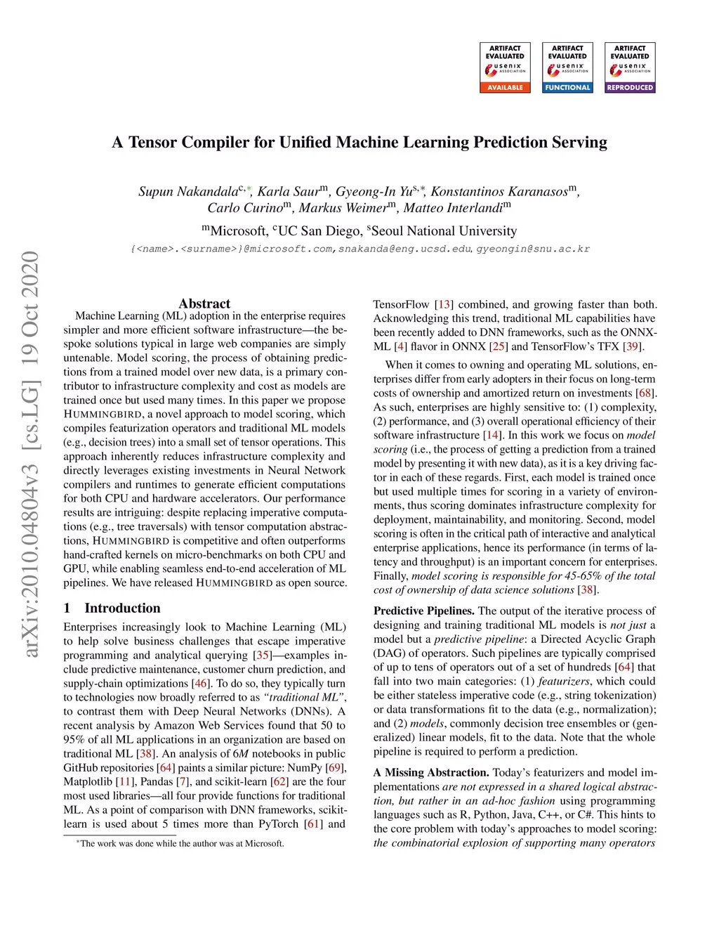 Machine Learning (ML) adoption in the enterprise requires simpler and more efficient software infrastructure---the bespoke solutions typical in large web companies are simply untenable. Model scoring, the process of obtaining predictions from a trained model over new data, is a primary contributor to infrastructure complexity and cost as models are trained once but used many times. In this paper we propose HUMMINGBIRD, a novel approach to model scoring, which compiles featurization operators and traditional ML models (e.g., decision trees) into a small set of tensor operations. This approach inherently reduces infrastructure complexity and directly leverages existing investments in Neural Network compilers and runtimes to generate efficient computations for both CPU and hardware accelerators. Our performance results are intriguing: despite replacing imperative computations (e.g., tree traversals) with tensor computation abstractions, HUMMINGBIRD is competitive and often outperforms hand-crafted kernels on micro-benchmarks on both CPU and GPU, while enabling seamless end-to-end acceleration of ML pipelines. We have released HUMMINGBIRD as open source.