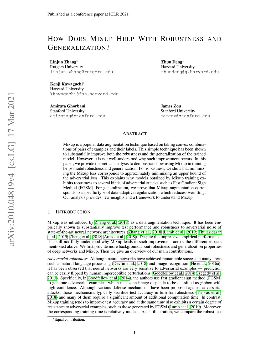 Mixup is a popular data augmentation technique based on taking convex combinations of pairs of examples and their labels. This simple technique has been shown to substantially improve both the robustness and the generalization of the trained model. However, it is not well-understood why such improvement occurs. In this paper, we provide theoretical analysis to demonstrate how using Mixup in training helps model robustness and generalization. For robustness, we show that minimizing the Mixup loss corresponds to approximately minimizing an upper bound of the adversarial loss. This explains why models obtained by Mixup training exhibits robustness to several kinds of adversarial attacks such as Fast Gradient Sign Method (FGSM). For generalization, we prove that Mixup augmentation corresponds to a specific type of data-adaptive regularization which reduces overfitting. Our analysis provides new insights and a framework to understand Mixup.