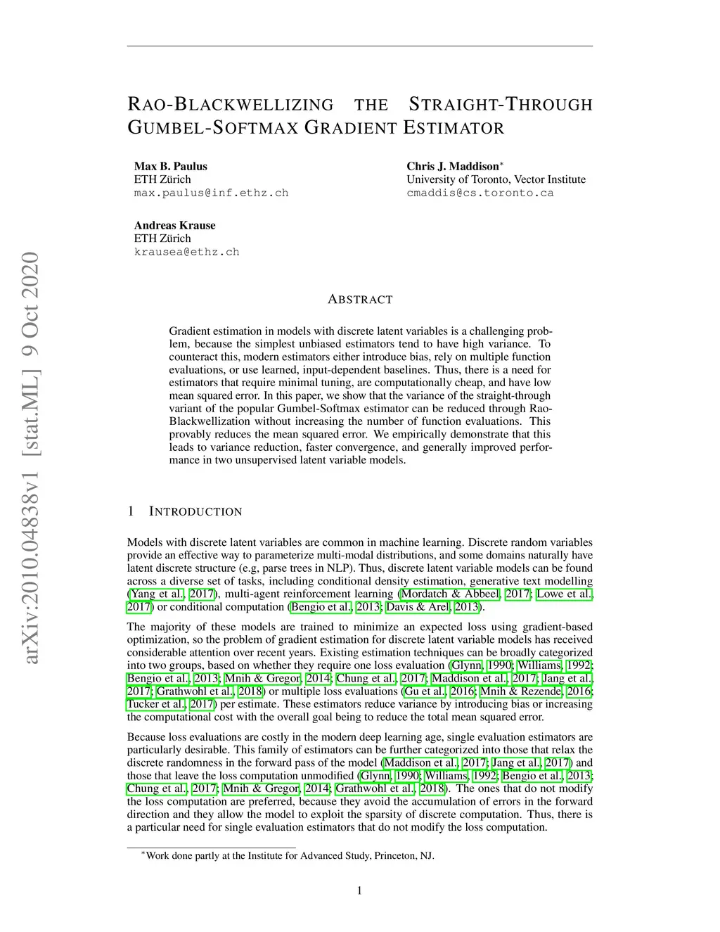 Gradient estimation in models with discrete latent variables is a challenging problem, because the simplest unbiased estimators tend to have high variance. To counteract this, modern estimators either introduce bias, rely on multiple function evaluations, or use learned, input-dependent baselines. Thus, there is a need for estimators that require minimal tuning, are computationally cheap, and have low mean squared error. In this paper, we show that the variance of the straight-through variant of the popular Gumbel-Softmax estimator can be reduced through Rao-Blackwellization without increasing the number of function evaluations. This provably reduces the mean squared error. We empirically demonstrate that this leads to variance reduction, faster convergence, and generally improved performance in two unsupervised latent variable models.