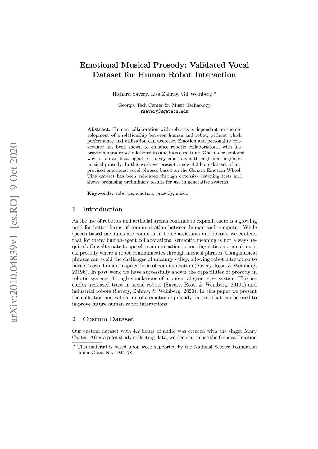 Human collaboration with robotics is dependant on the development of a relationship between human and robot, without which performance and utilization can decrease. Emotion and personality conveyance has been shown to enhance robotic collaborations, with improved human-robot relationships and increased trust. One under-explored way for an artificial agent to convey emotions is through non-linguistic musical prosody. In this work we present a new 4.2 hour dataset of improvised emotional vocal phrases based on the Geneva Emotion Wheel. This dataset has been validated through extensive listening tests and shows promising preliminary results for use in generative systems.