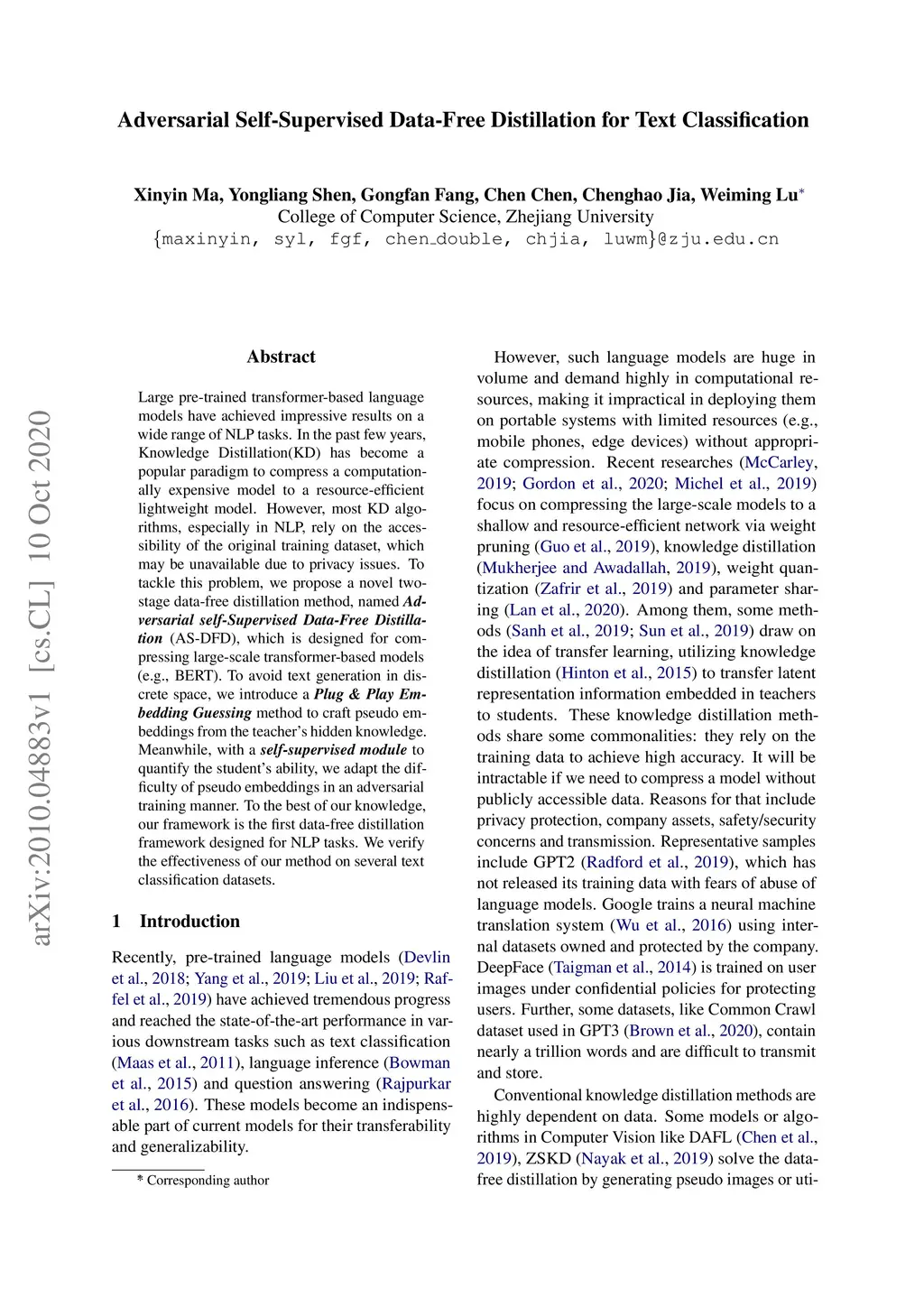 Adversarial Self-Supervised Data-Free Distillation for Text